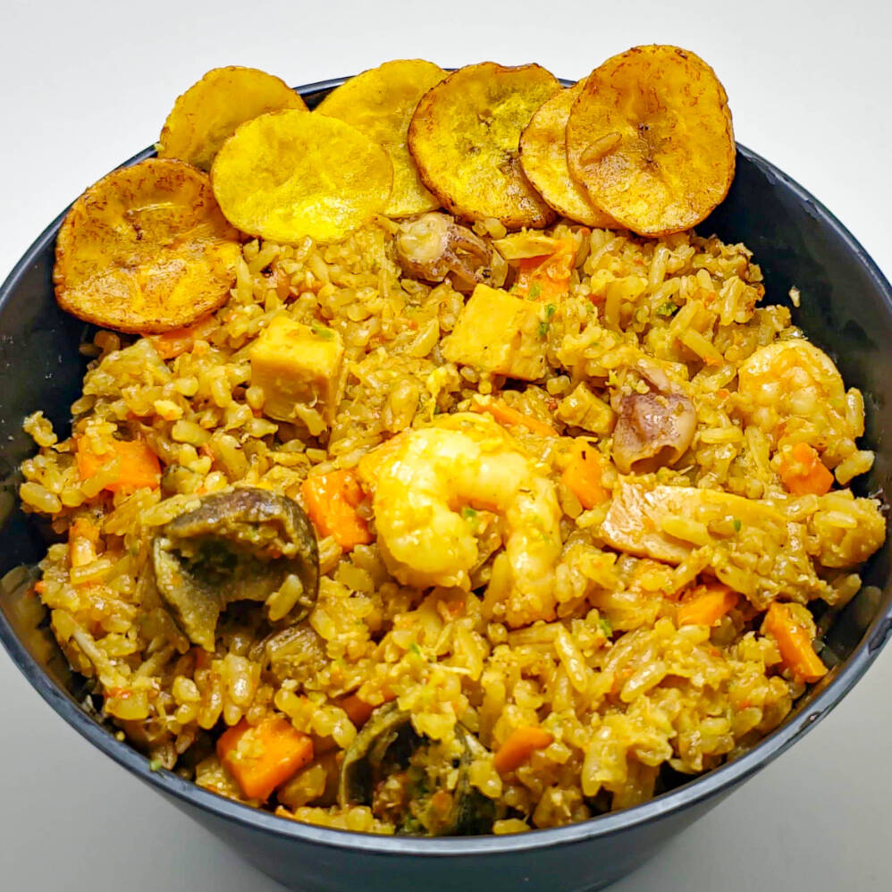 Arroz fusión al wok, pollo, cerdo, costilla, chorizo, chicharrones totiados y plátano maduro. porciones de 800 g.