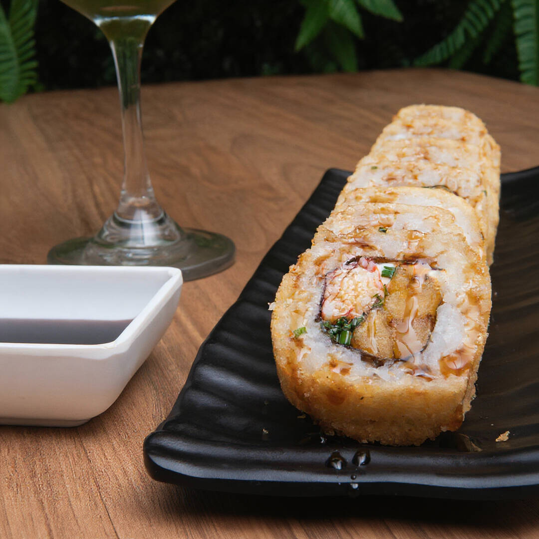 Rollo relleno de Pollo furay, queso crema y cebollín, envuelto en panko