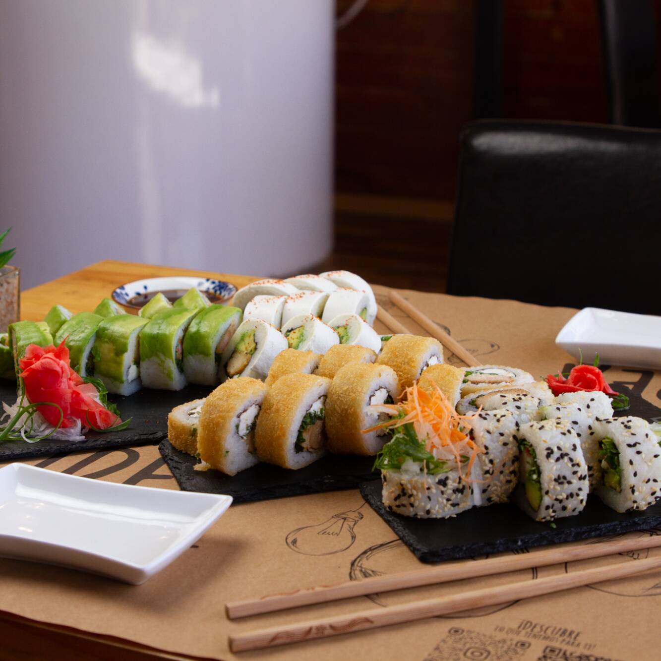 Rolll: 10 bocados de pollo tempurado, aguacate envuelto en queso philadelphia Roll 2:10 bocados de camarón, queso philadelphia envuelto en aguacate Roll 3: 10 bocados de palmito cangrejo, aguacate envuelto en ajonjolí Roll 4: 10 bocados de carne, queso philadelphia envuelto en panko tempura Roll 5:10 bocados de pollo teriyaki, queso philadelphia envuelto en panko tempura.