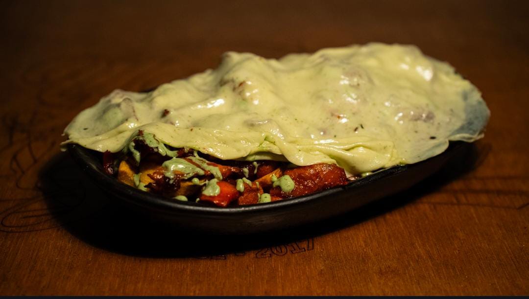 Tortilla, ripio, carne de res, queso, tocineta, tomate, salsa de la casa.