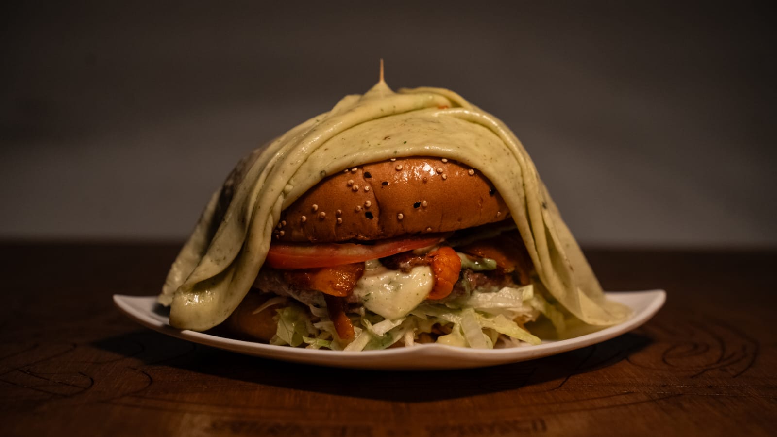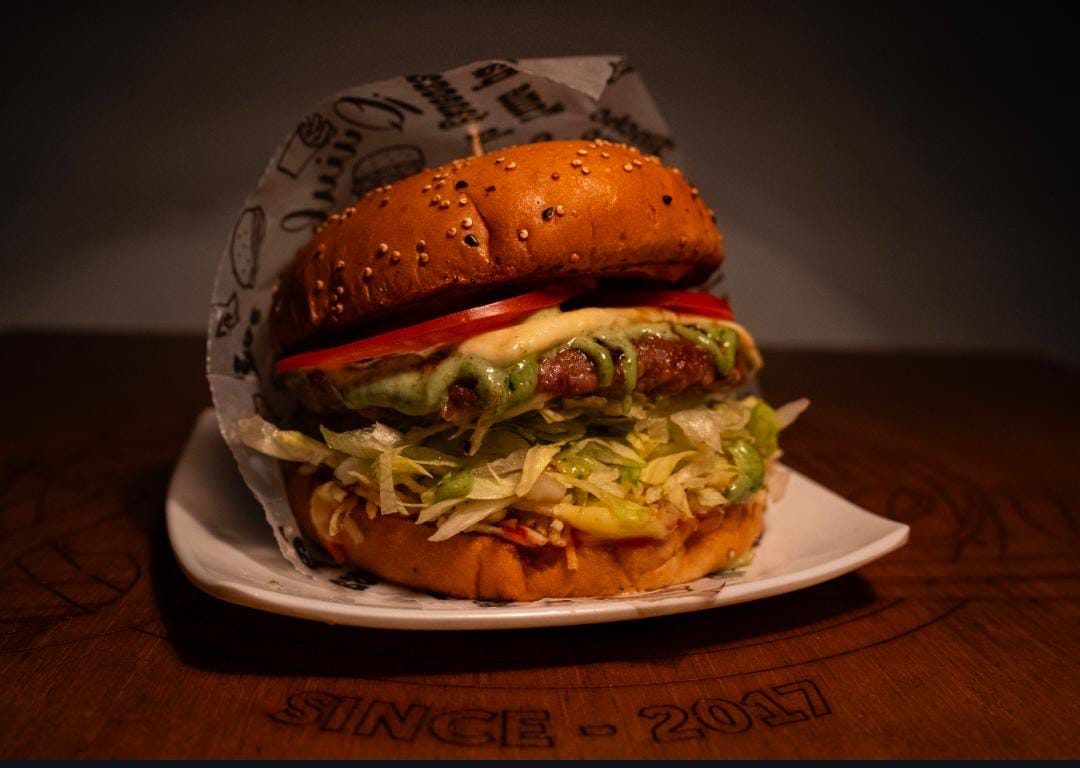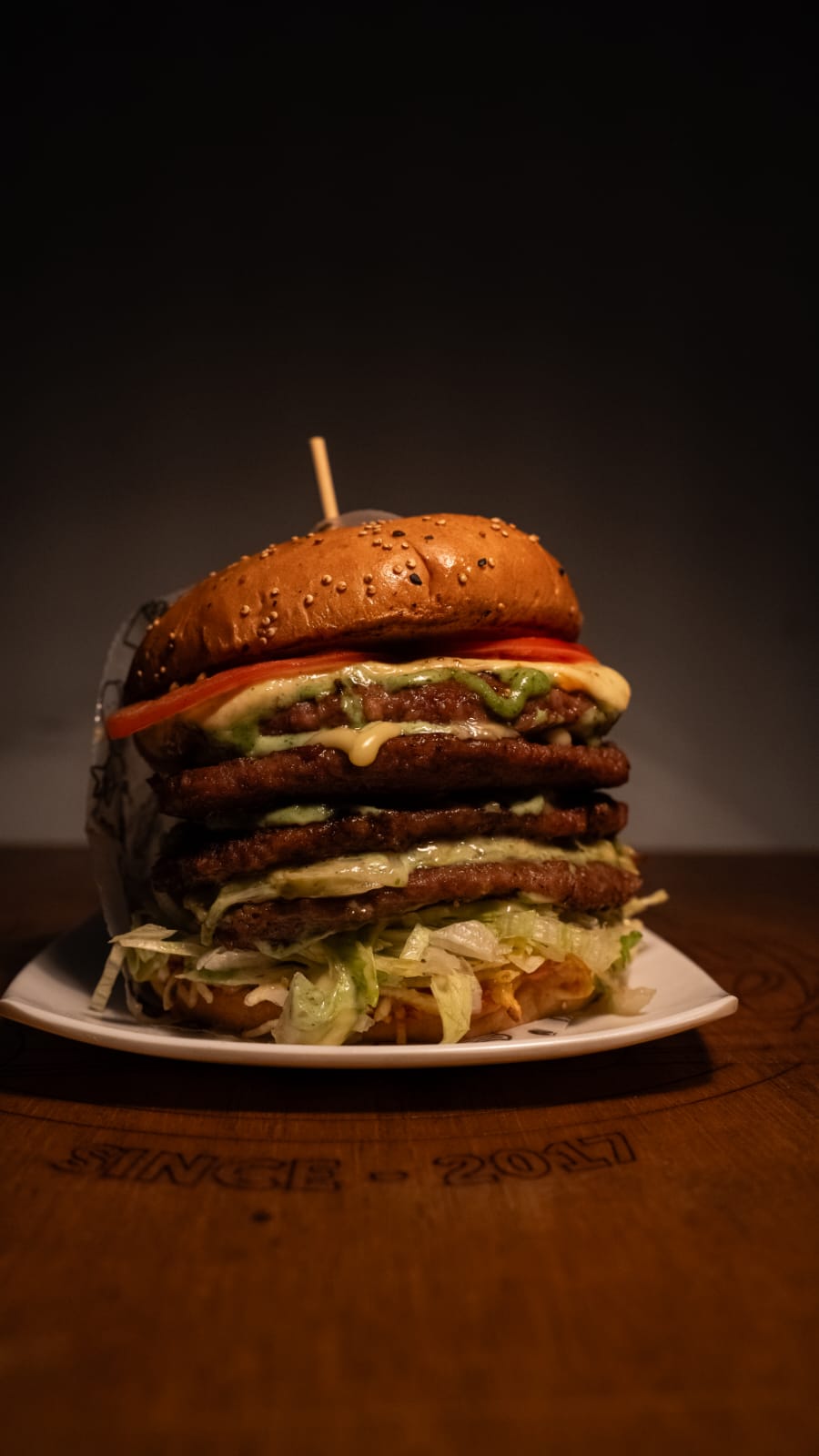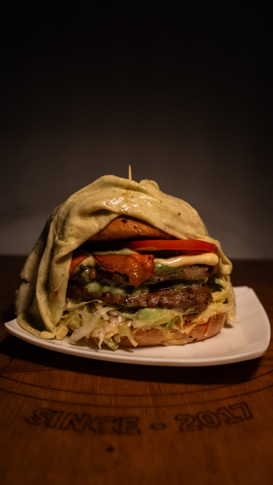 Pan, ripio, lechuga, doble carne, queso, tocineta, tomate, salsa de la casa, bañada en queso.