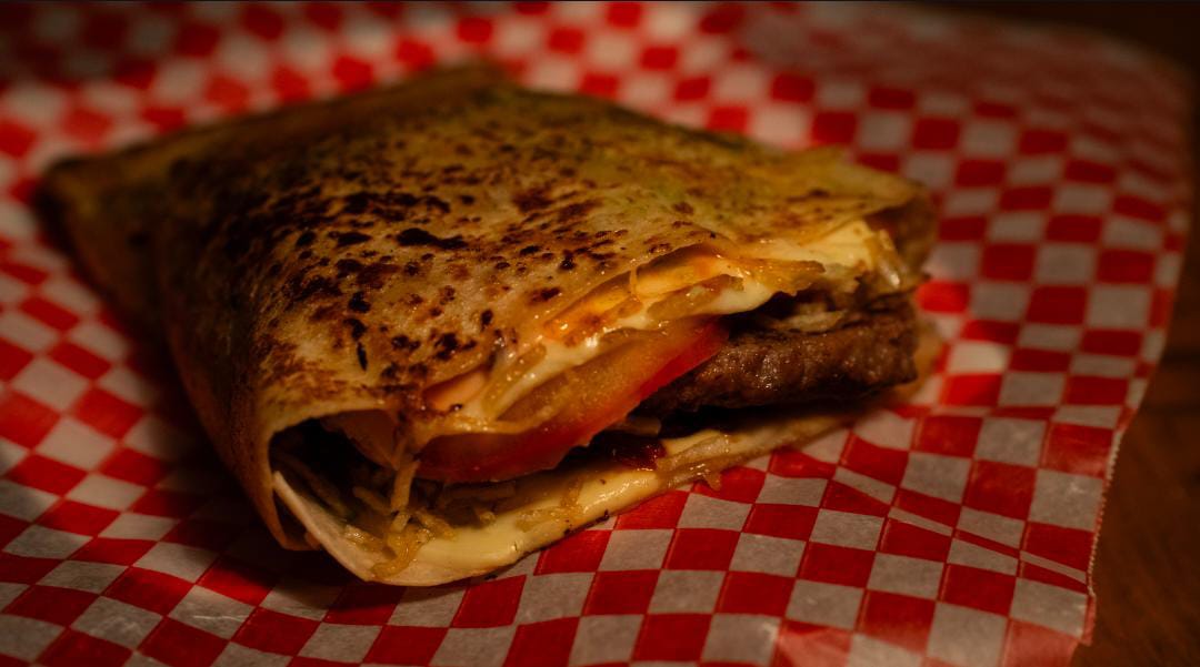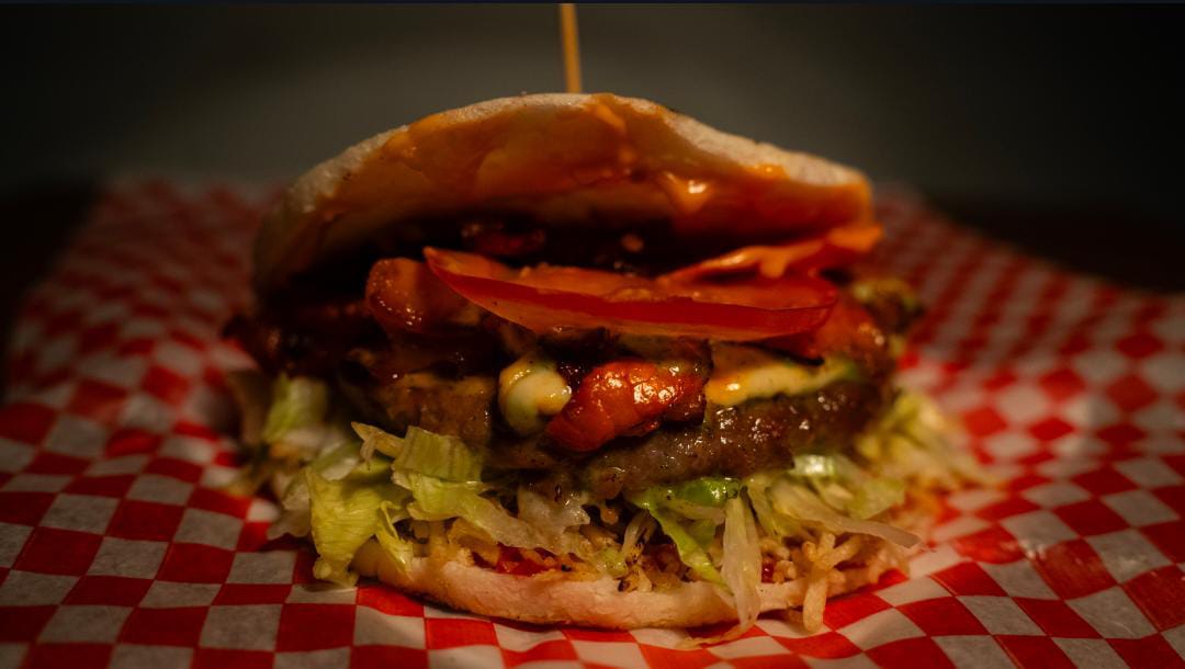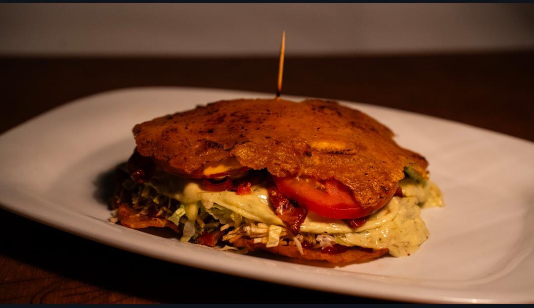 Arepa, ripio, lechuga, carne de res, queso, tocineta, salsa de la casa.