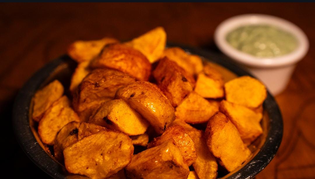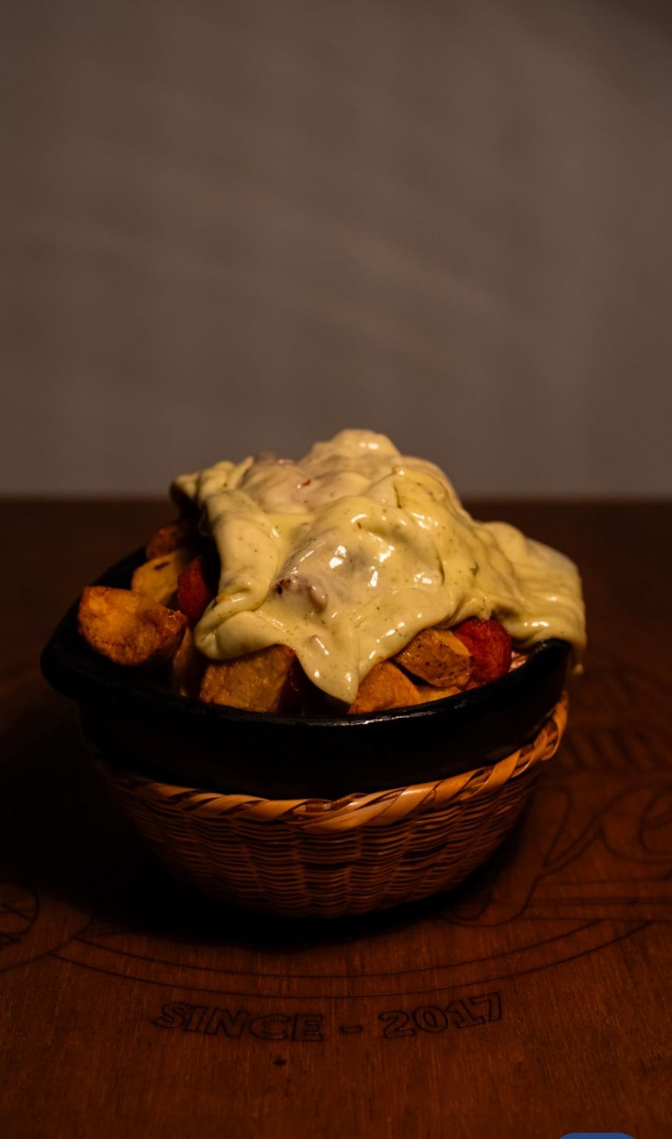 Papa, salchicha, queso, tocineta, salsa de la casa.