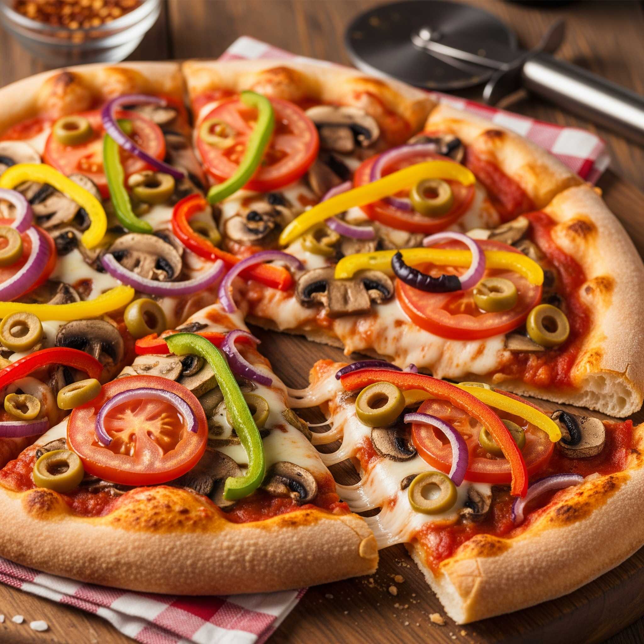 Tomate, cebolla roja, champiñones, pimentón rojo, amarillo y verde o aceitunas verdes.