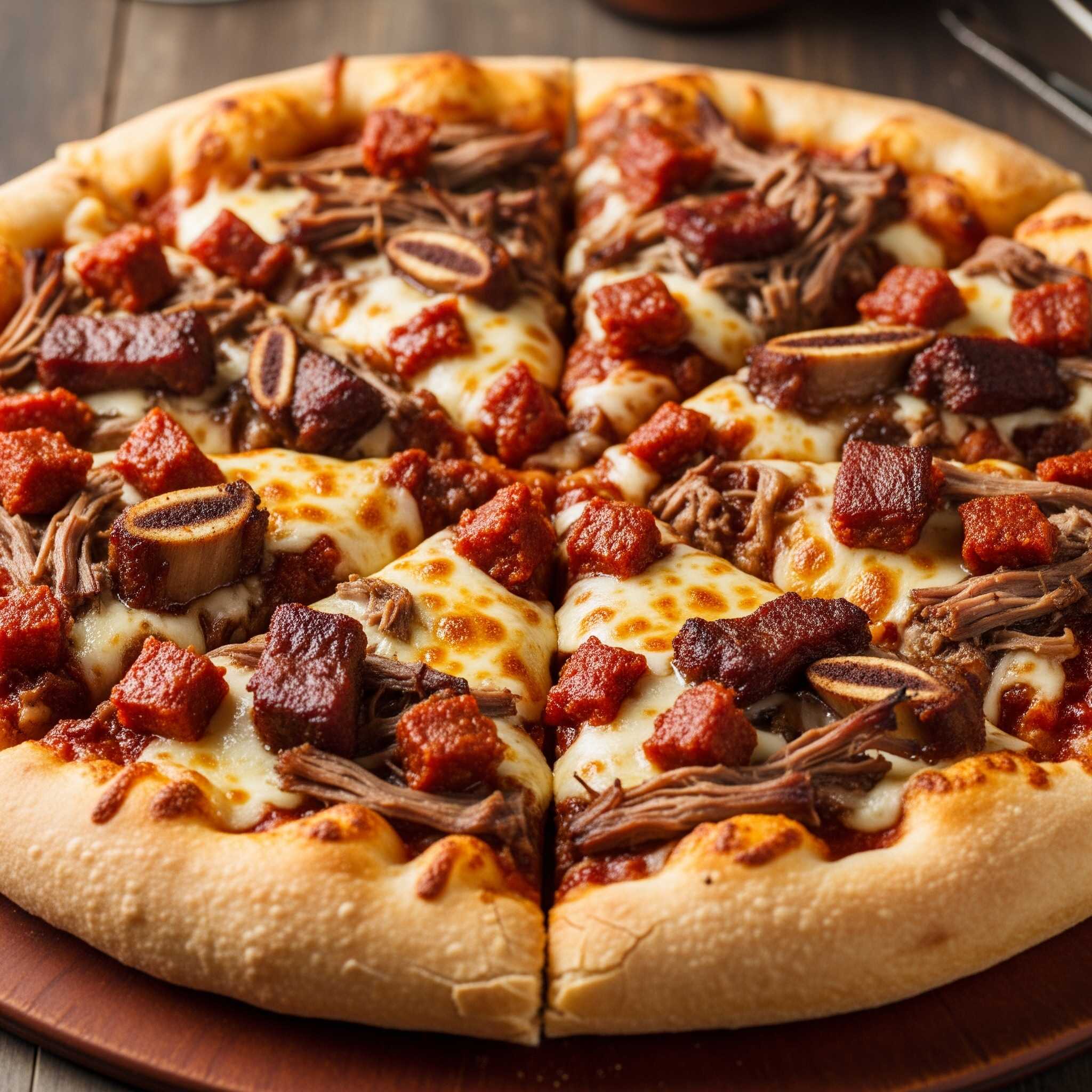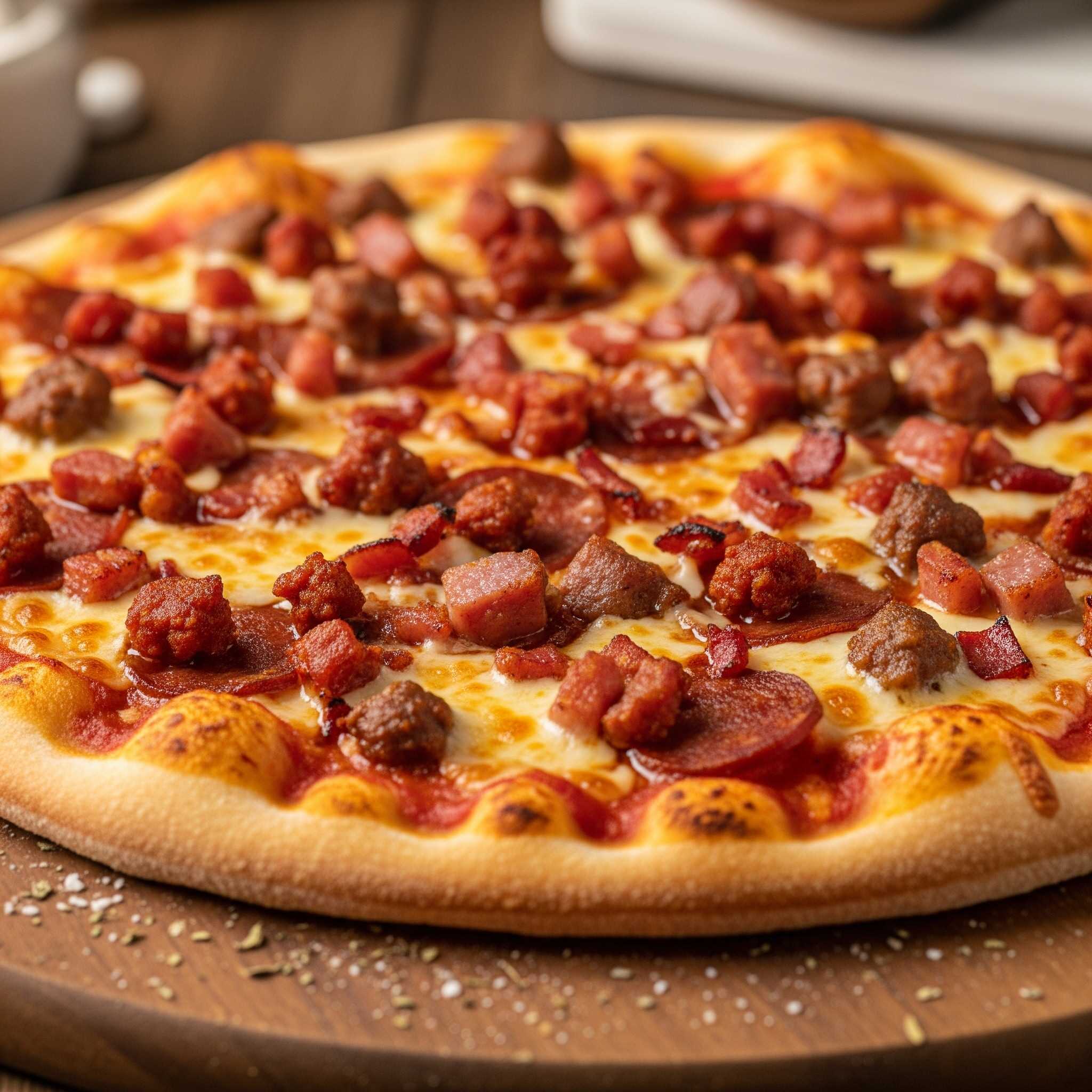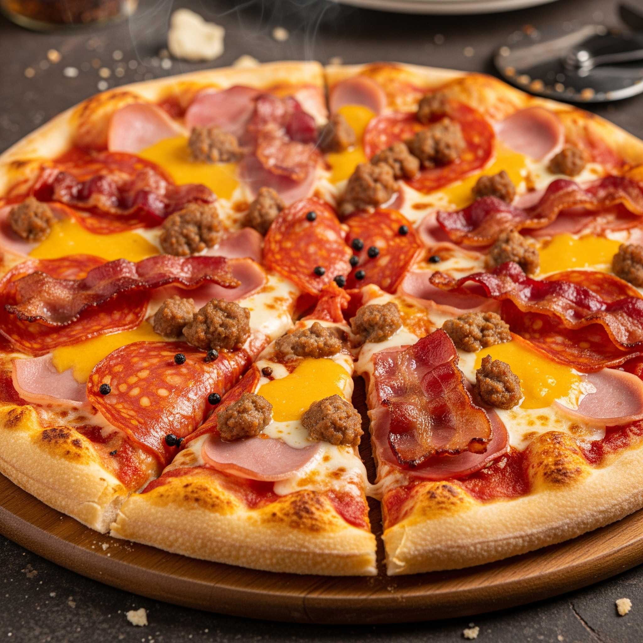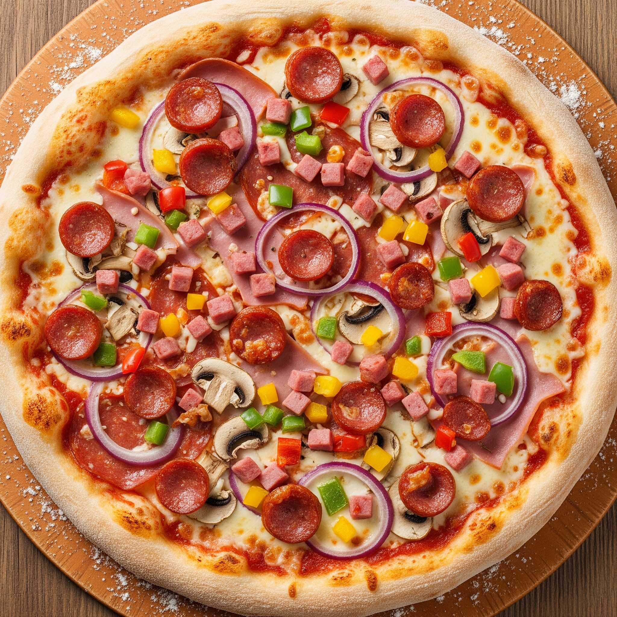 Salami, jamón, cebolla roja, champiñón, pimentón rojo, verde y amarillo y cábano.
