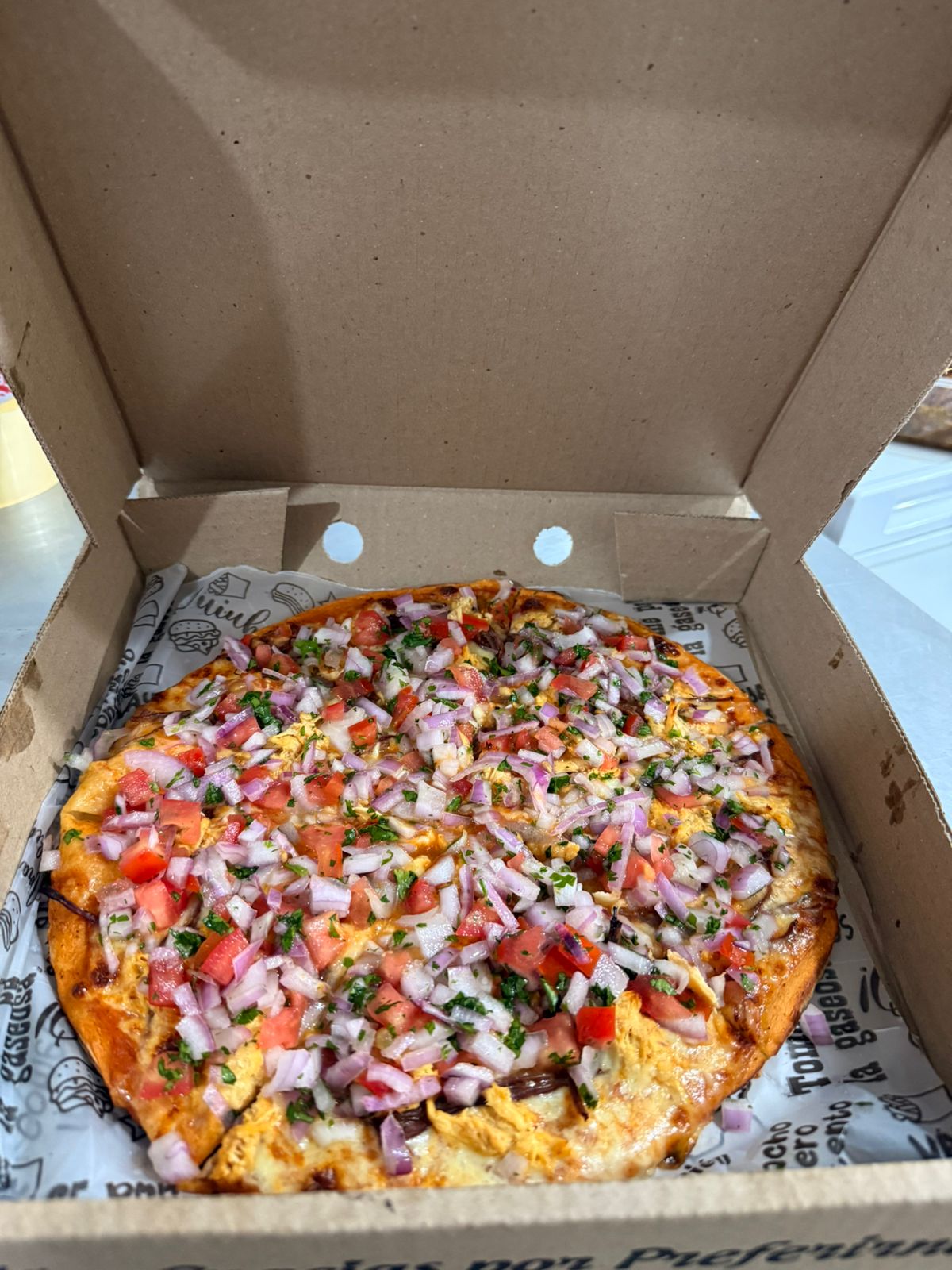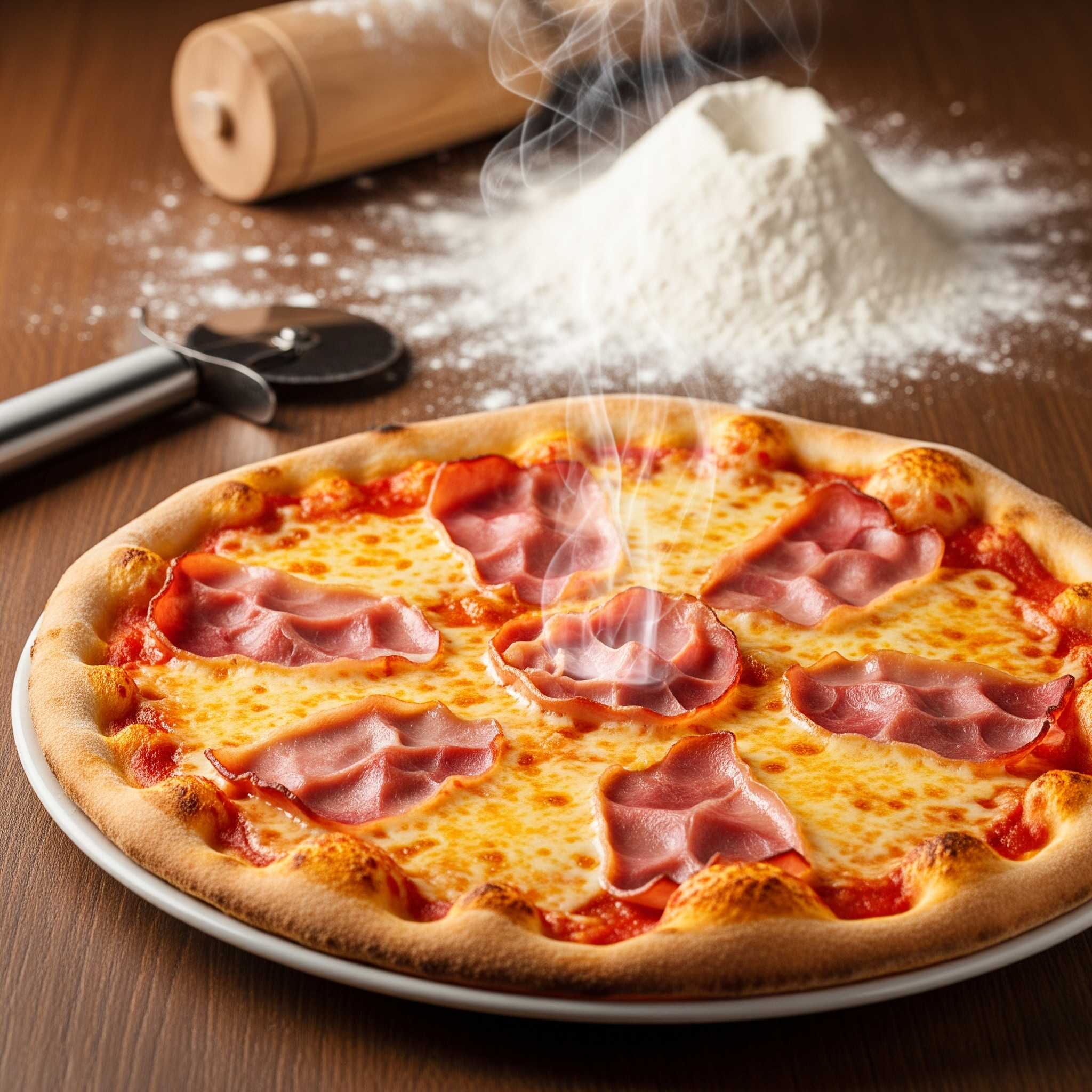 1 Pizza mitad hawaiana de jamón, queso y piña y mitad de pollo con champiñones.