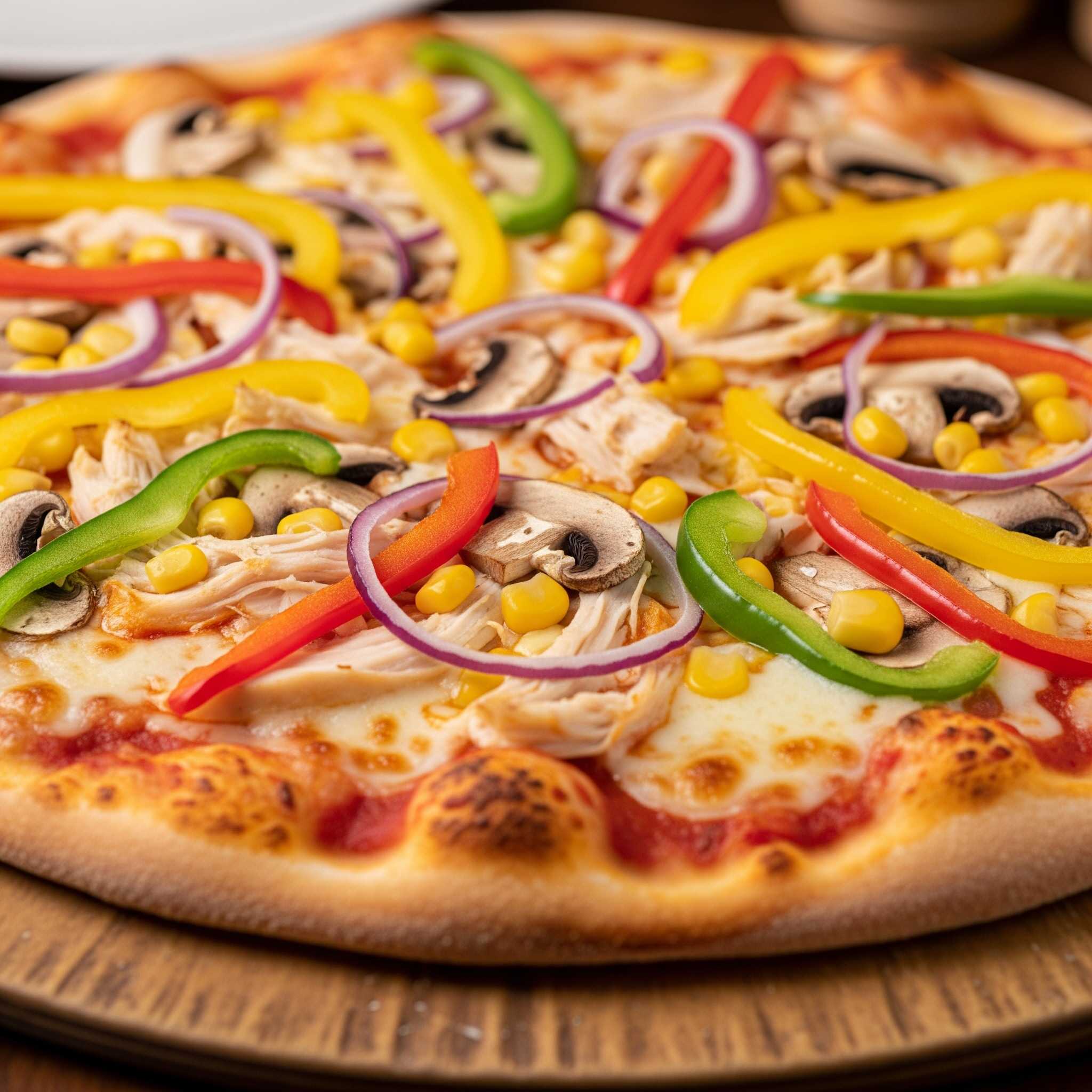 Pollo, maíz tierno, cebolla roja, champiñón, pimentón rojo, amarillo y verde.