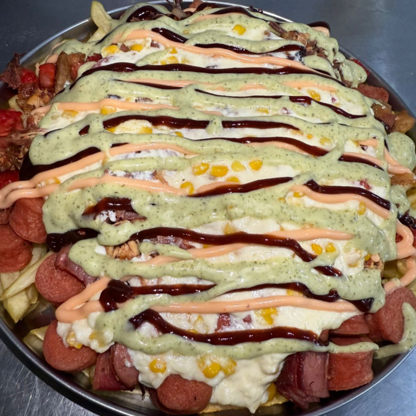 Salchipapa completa (papa,salchicha,pollo,carne,chicharron,costilla,tocineta,ranchera,queso y maiz)