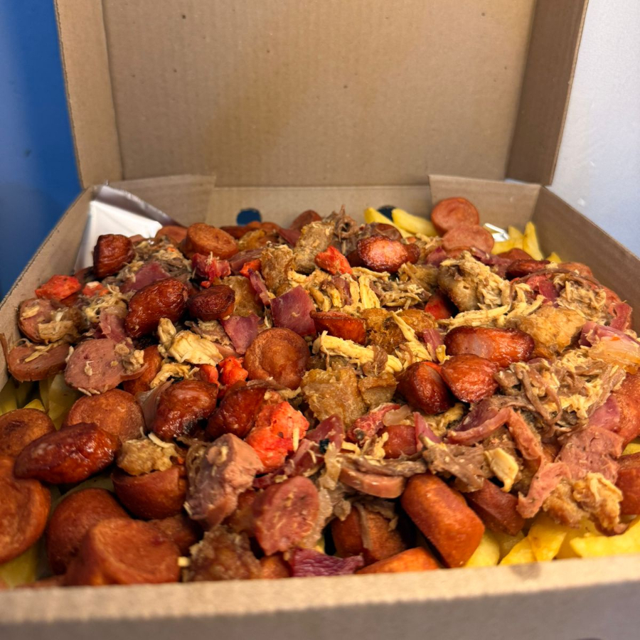 Salchipapa completa ( papa, salchipapa,chicharron,carne,desmechada,pollo,costilla,queso y maiz)