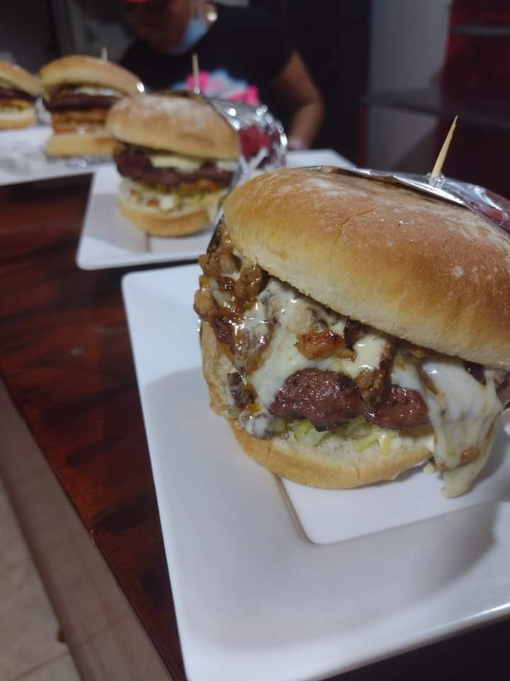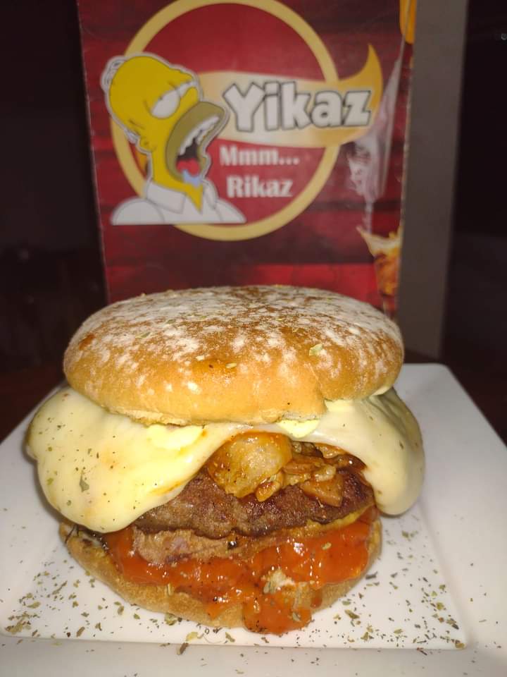 Carne, queso, tomate, lechuga, cebolla, ripio, pan artesanal y salsa de la casa.