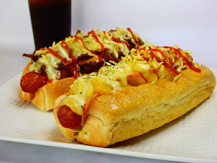 Salchicha americana, jamón, queso, ripio, cebolla y salsa de la casa.
