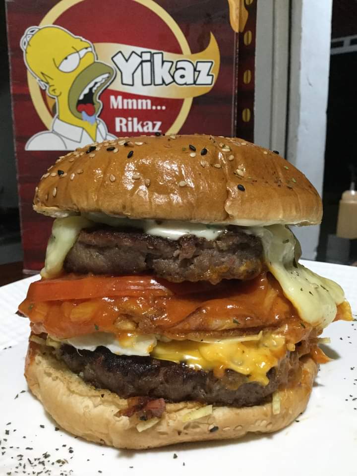 Doble carne, tocineta, jamón, queso, tomate, lechuga, cebolla, ripio, pan artesanal y salsa de la casa.