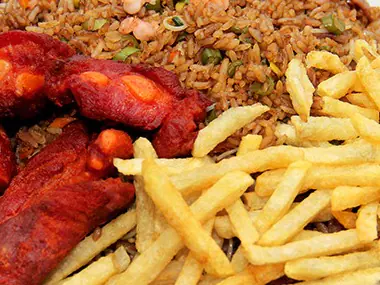 (sugerido 2 persona) 700gr de arroz con Res , cerdo , pollo , chorizo , maduro , verduras + papas a la francesa 150gr + 2 bebidas 250ml a disposición de la tienda