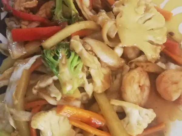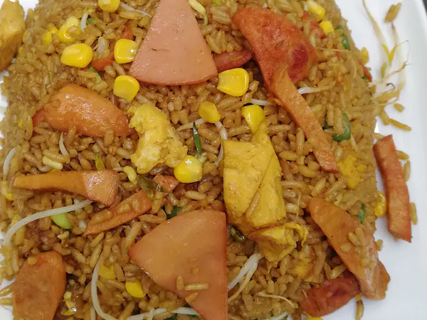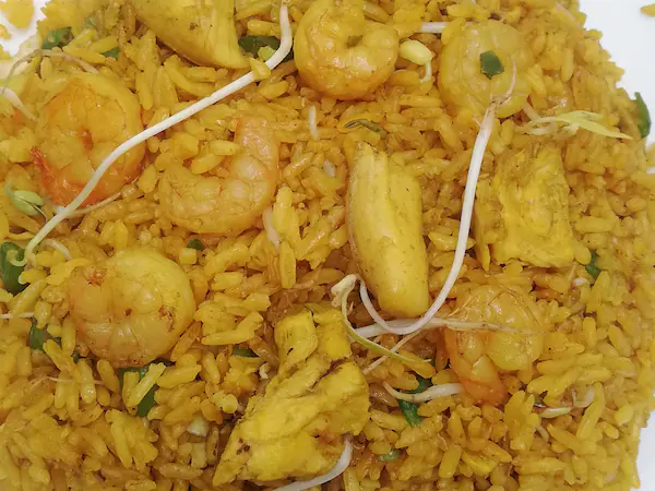 (sugerido 1 persona) Arroz con pollo, jamón, camarones, cerdo, verduras y raíces.