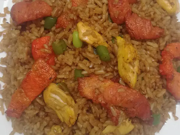 Arroz amarillo con pollo, salchicha llanera, verduras mixtas, cebolla, arveja, pimentón y zanahoria. Tamaño a elección.