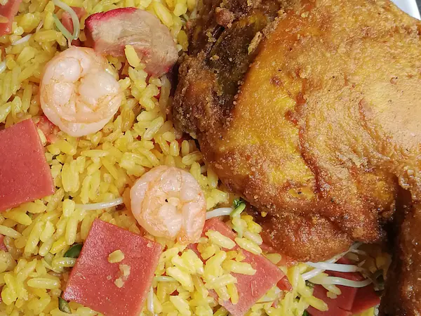 2 libras de arroz amarillo, jamón camarones cerdo pollo frito+ 1 pernil