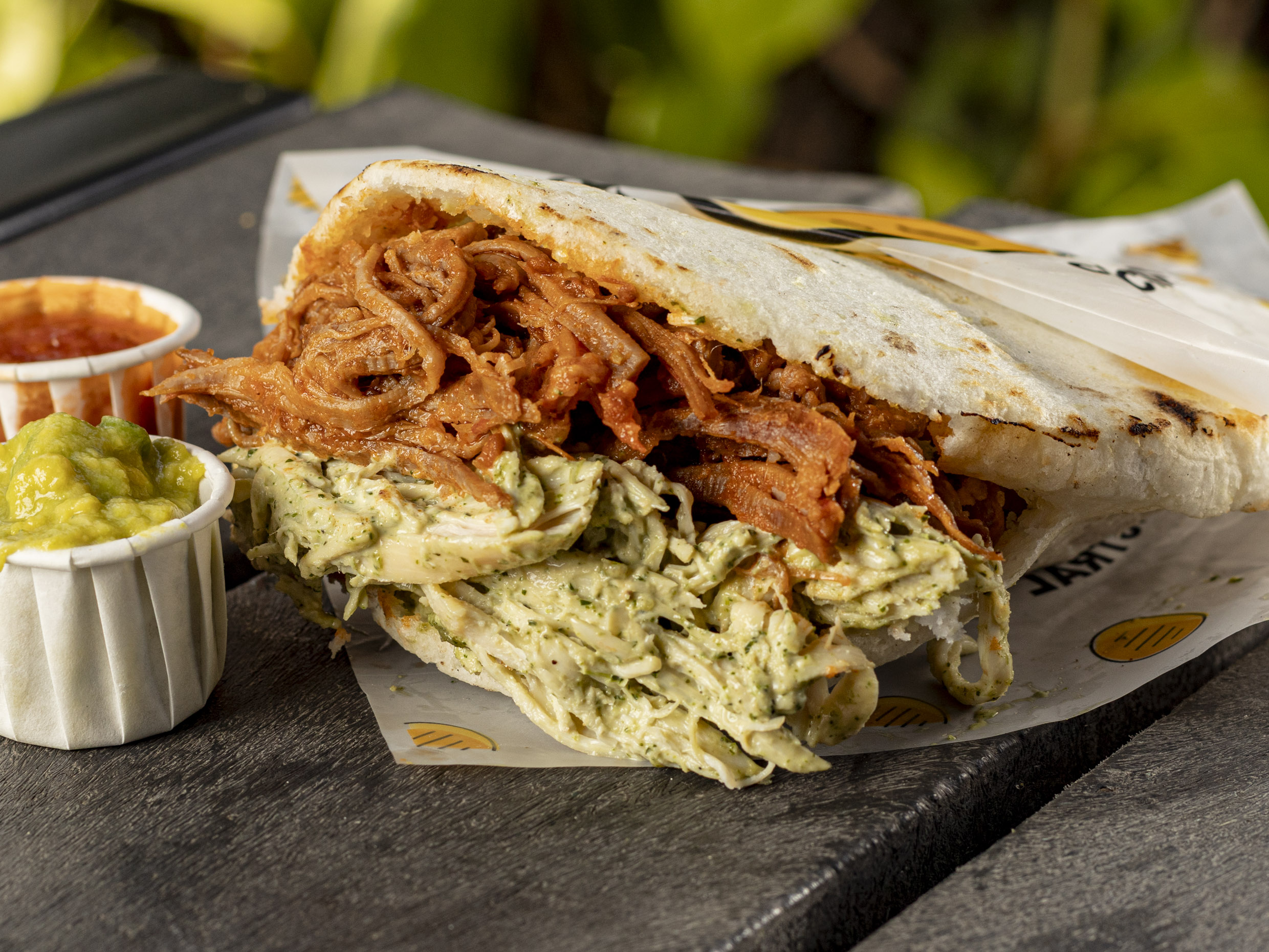 Arepa con carne desmechada en salsa ancestral y pollo desmechado en mayonesa casera de cilantro.