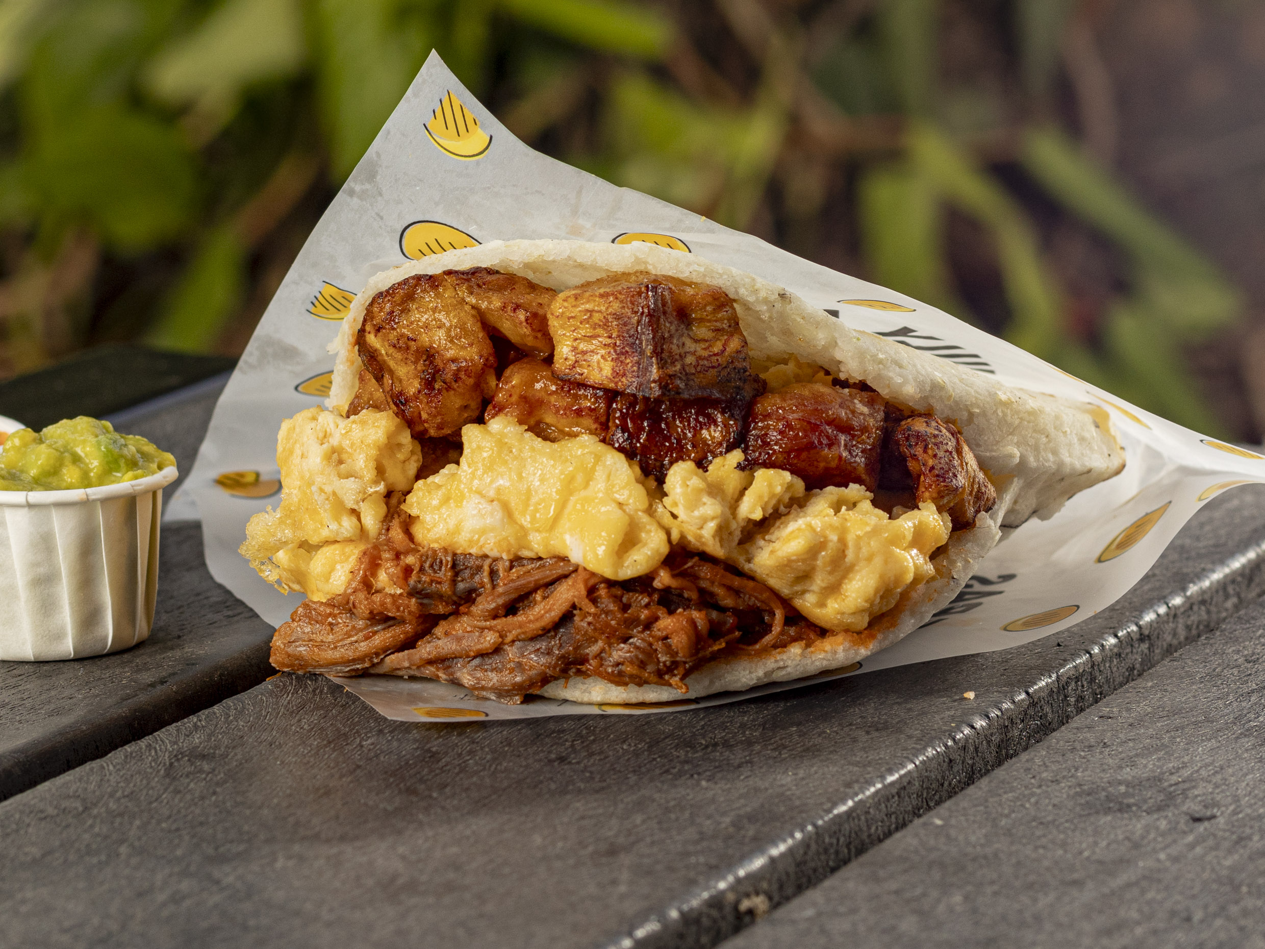 Arepa con carne desmechada en salsa ancestral, huevos revueltos y maduritos asados.