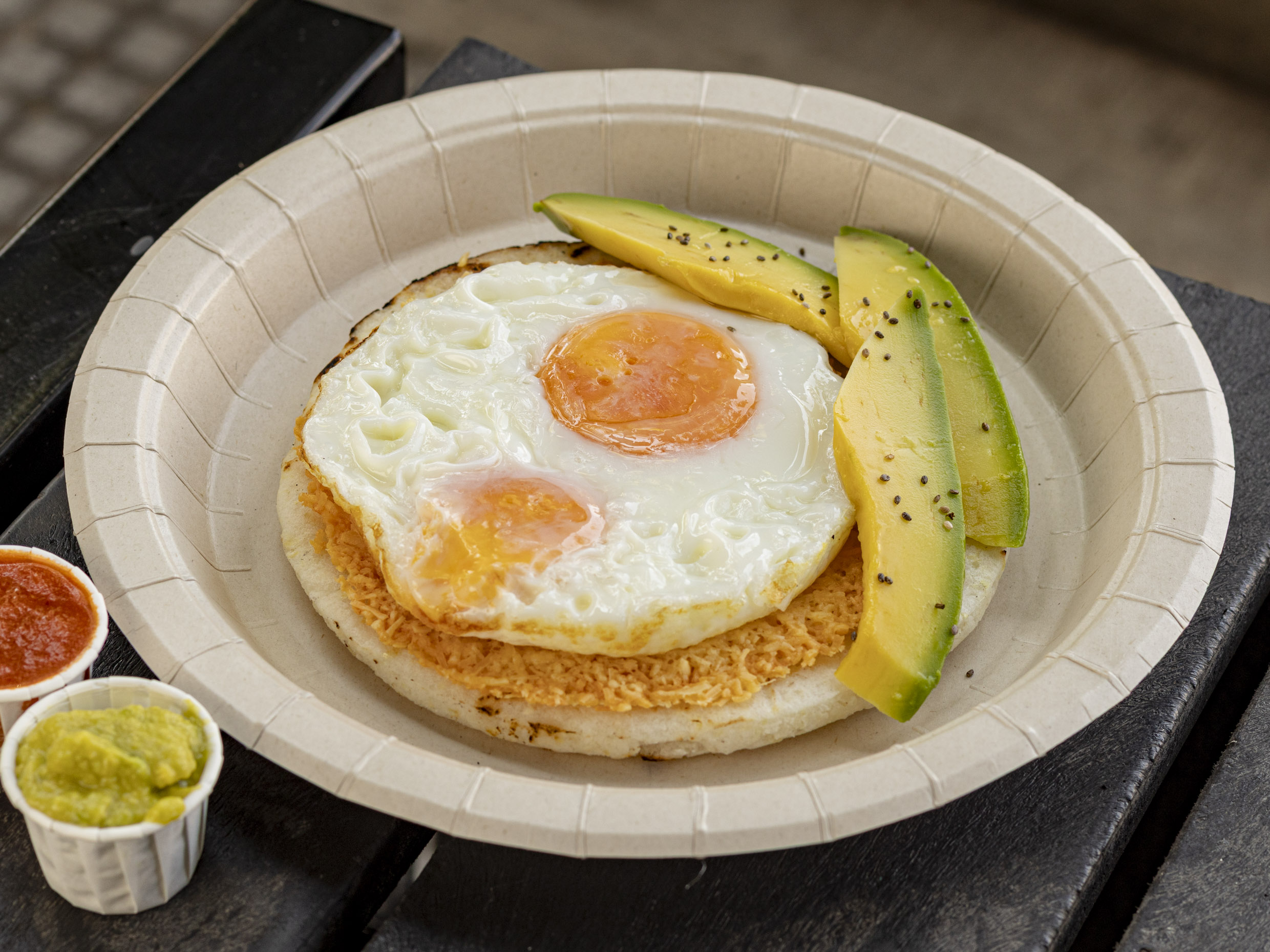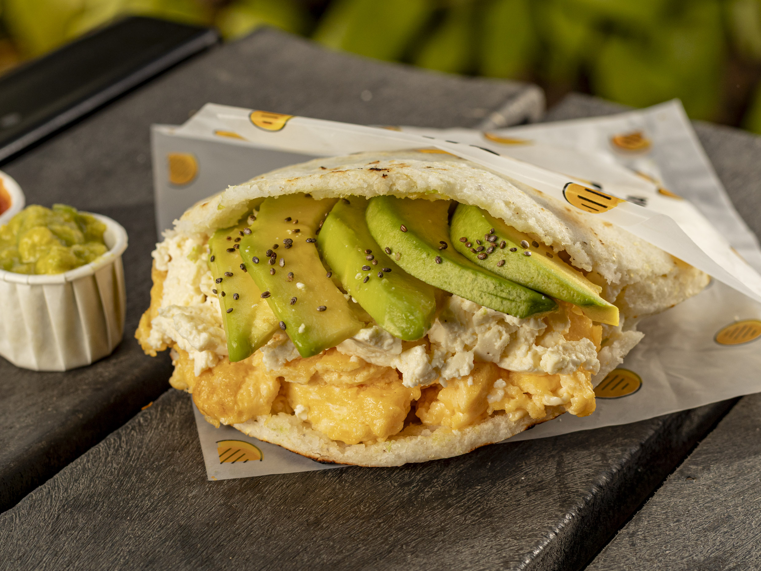 Arepa con huevo revuelto, tajas de aguacate, queso cuajada y semillas de chía.