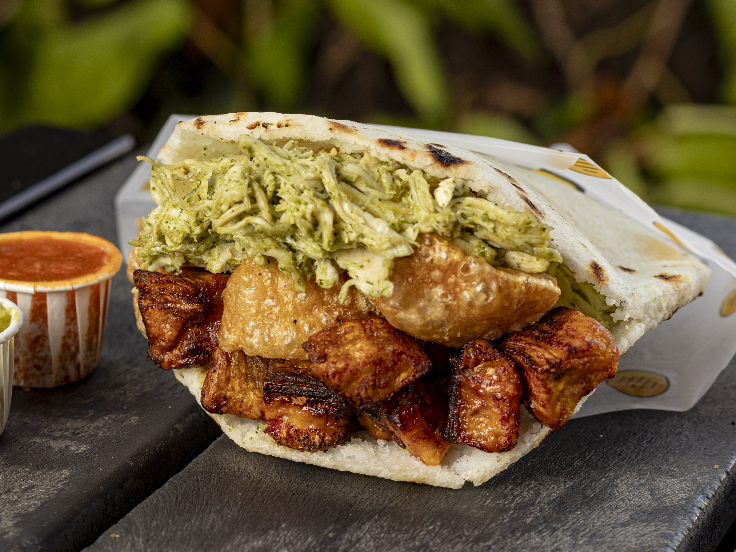 Arepa con pollo desmechado en salsa casera de cilantro, maduritos asados, queso fundido, croqueta de queso parmesano y un toque especial de chicharrón.