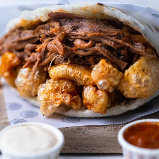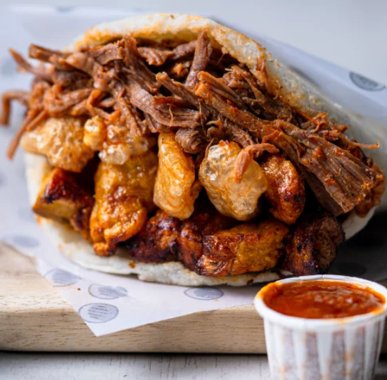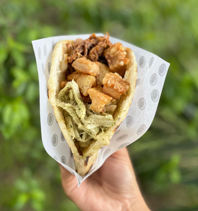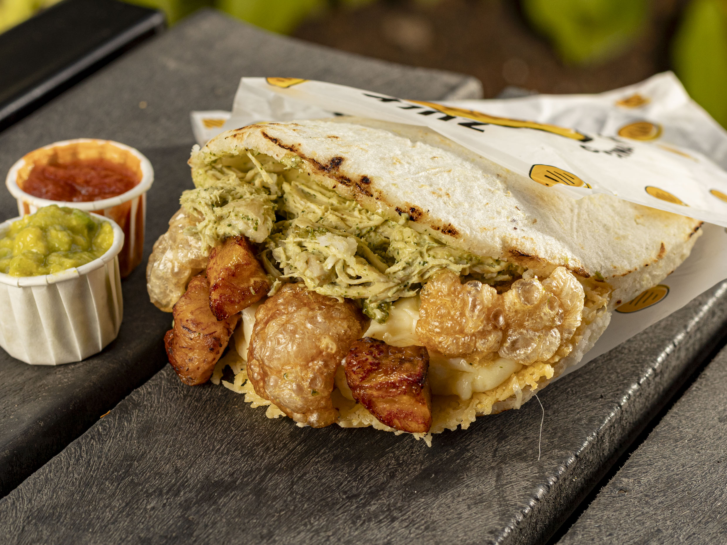 Arepa con carne desmechada en salsa ancestral, pollo desmechado salsa casera de cilantro y chicharrón crocantico.