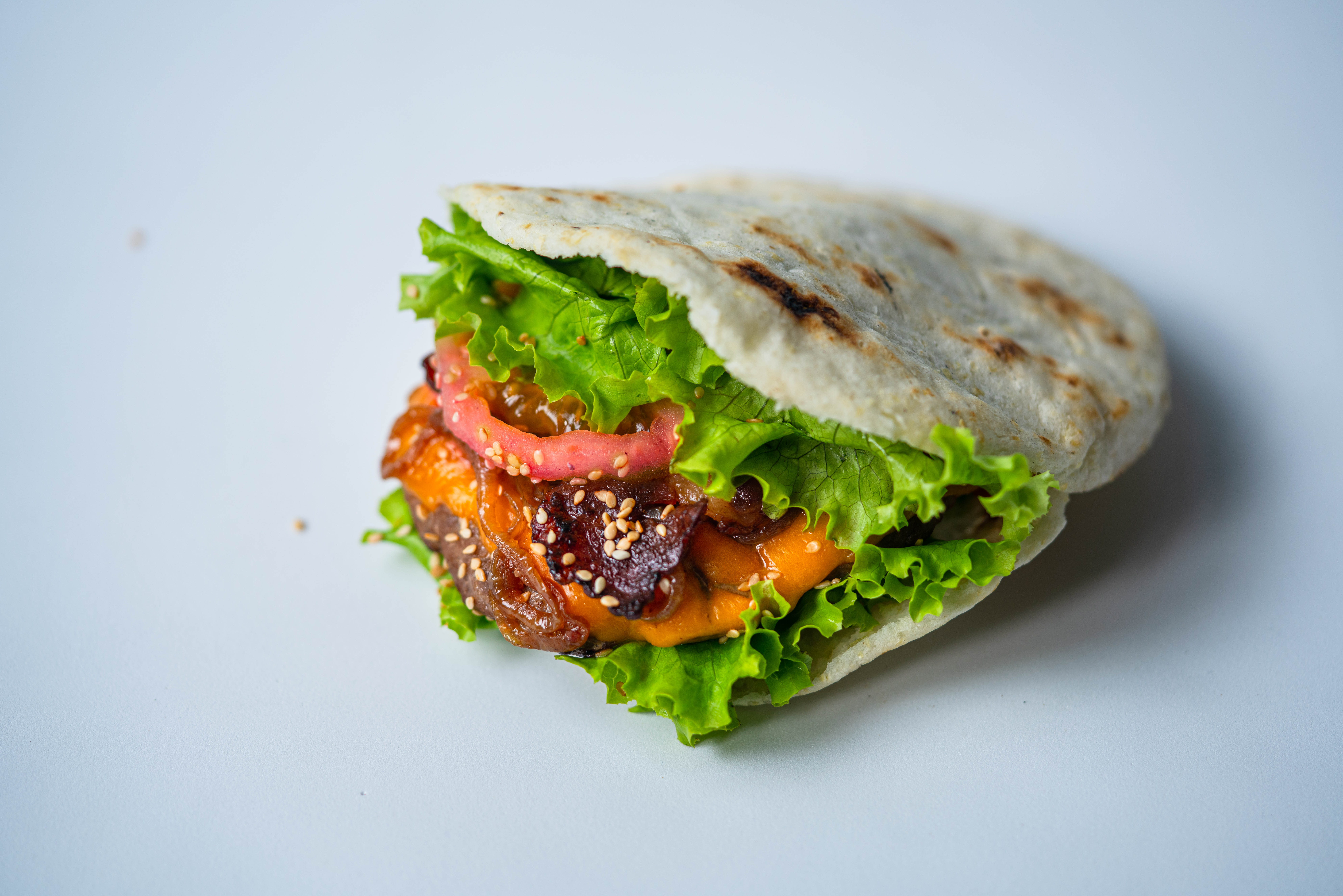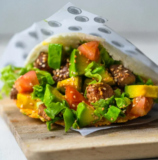 Arepa con pulpa de cerdo ancestral, tomate, lechuga, aguacate y crocante de queso parmesano.