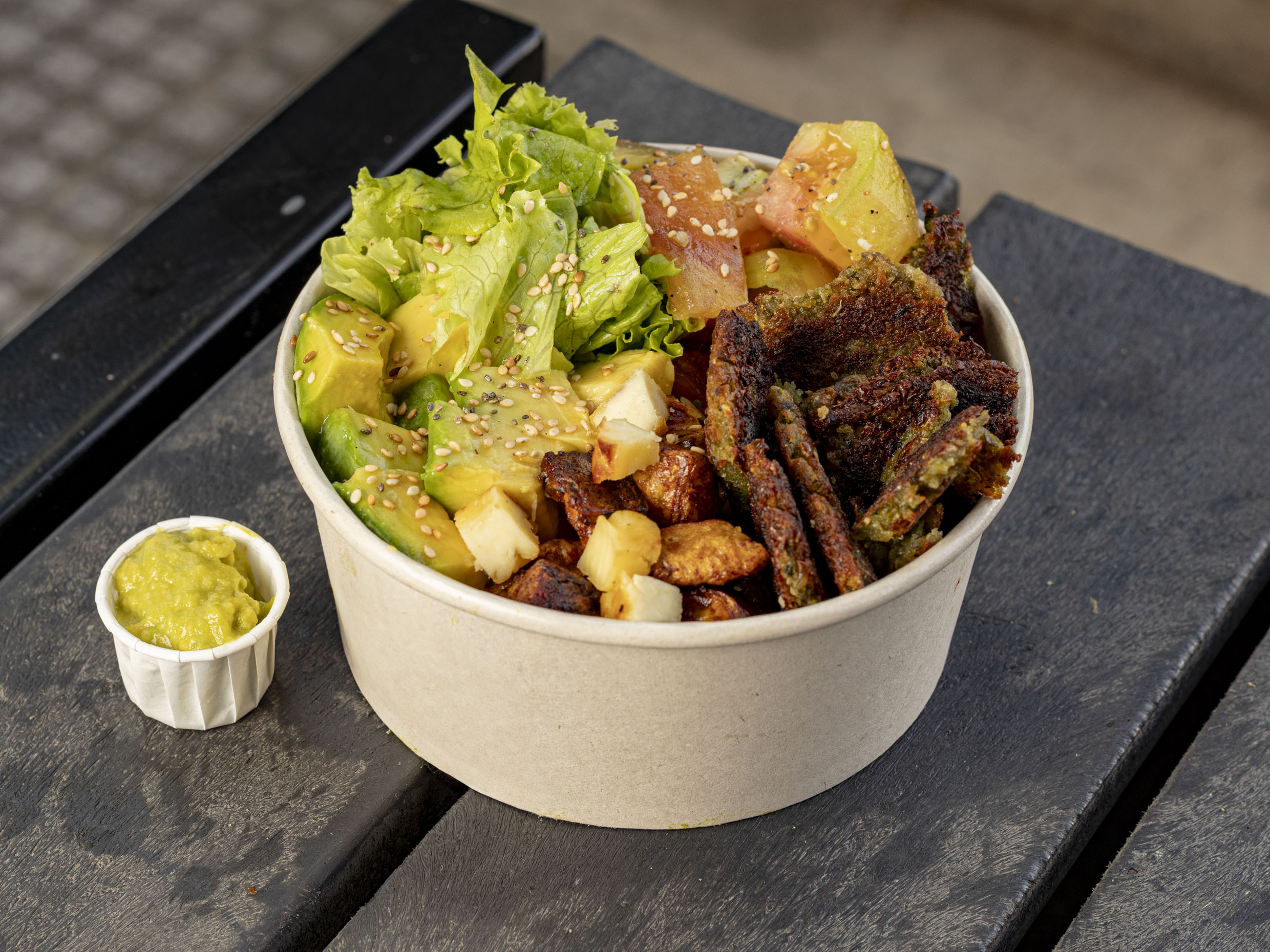 Bowl con pollo en salsa casera de cilantro, almendras tostadas, arroz, maíz, crocante de queso parmesano, lechuga, aguacate, tomate, semillas de chía, ajonjolí, arepa asada. Acompañado de nuestro guacamole.