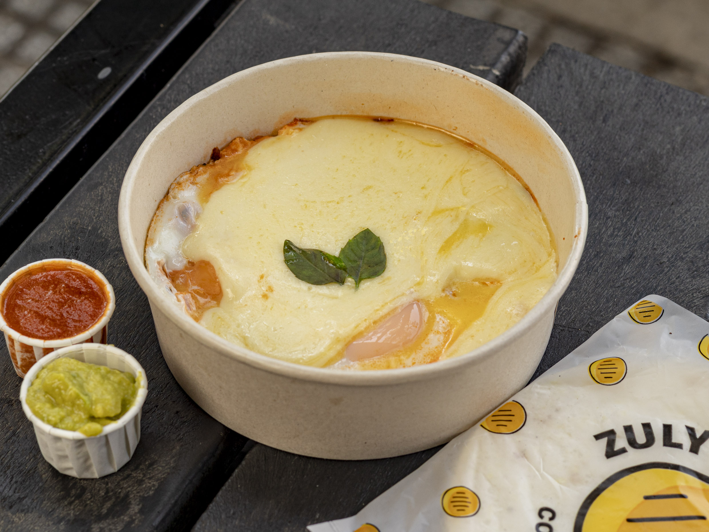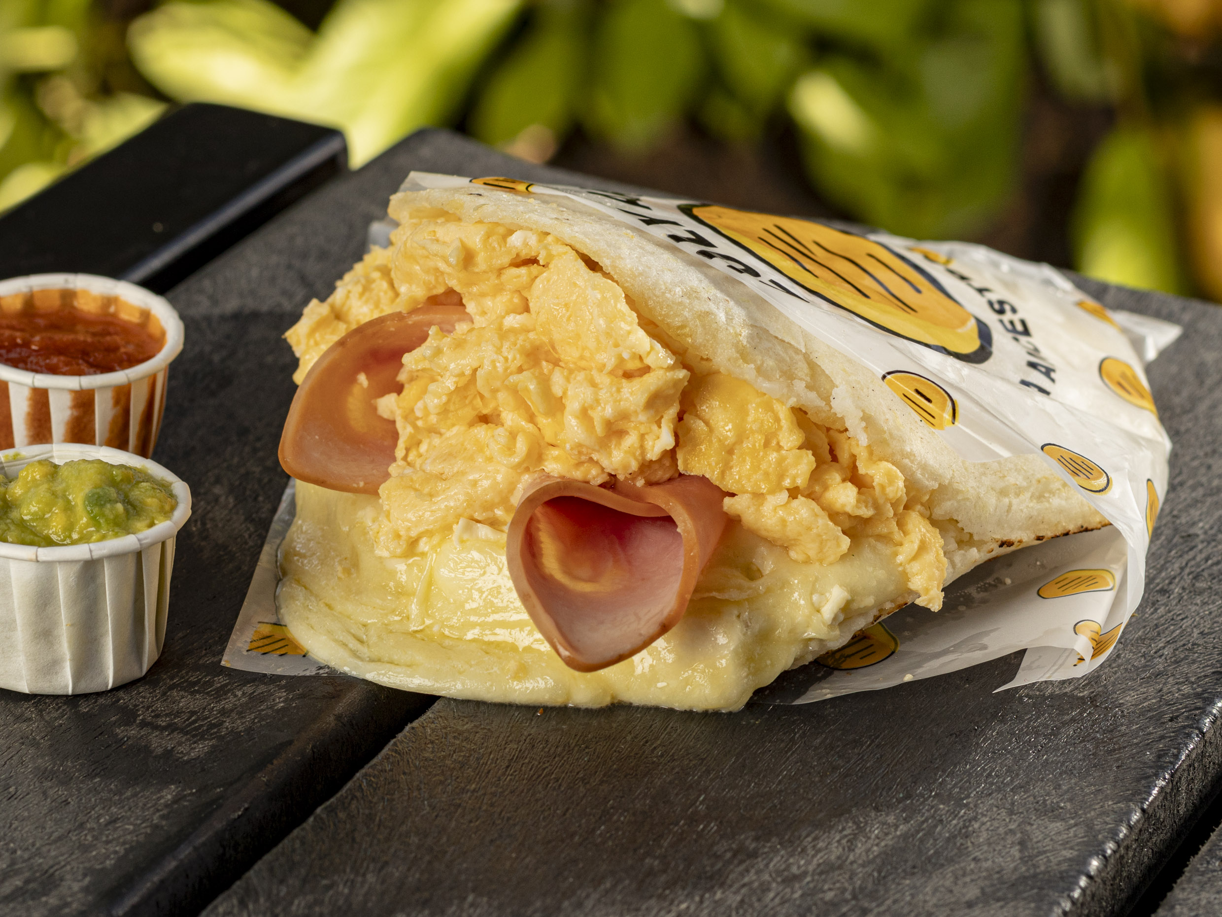 Arepa con huevo revuelto, jamón artesanal y queso fundido con salsa ancestral.