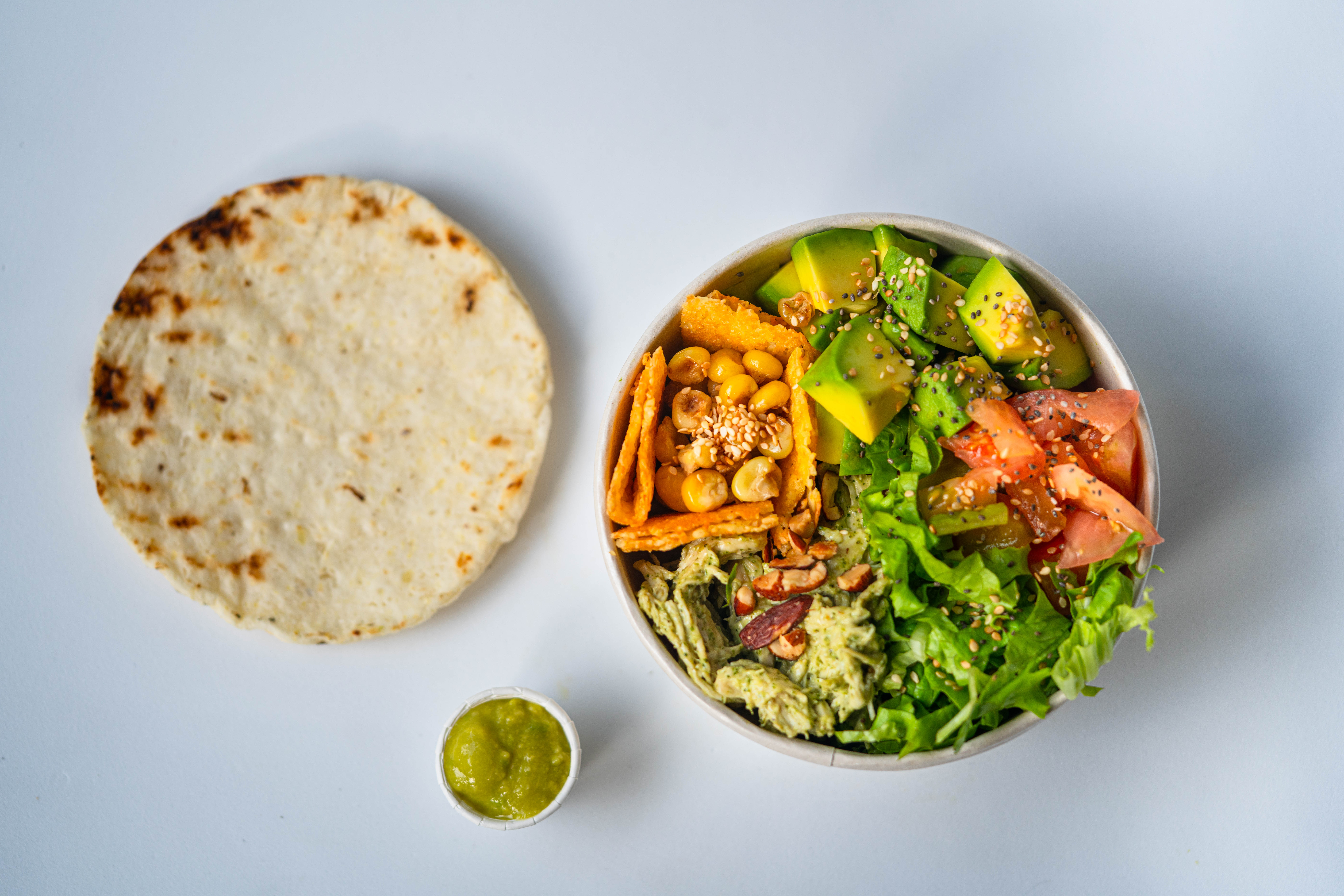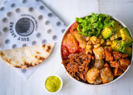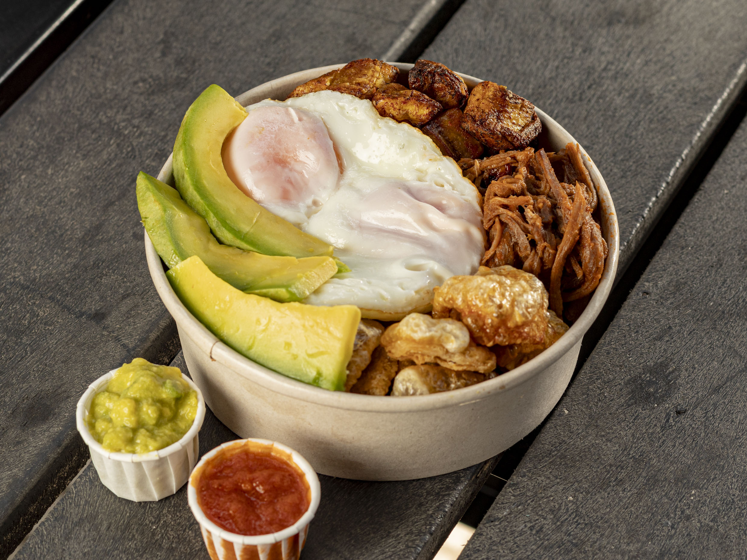 Bowl con carne desmechada en salsa ancestral, pollo desmechado en salsa casera de cilantro, arroz, maíz, tomate, aguacate y una arepa asada a la parrilla. acompañado de nuestro delicioso guacamole.