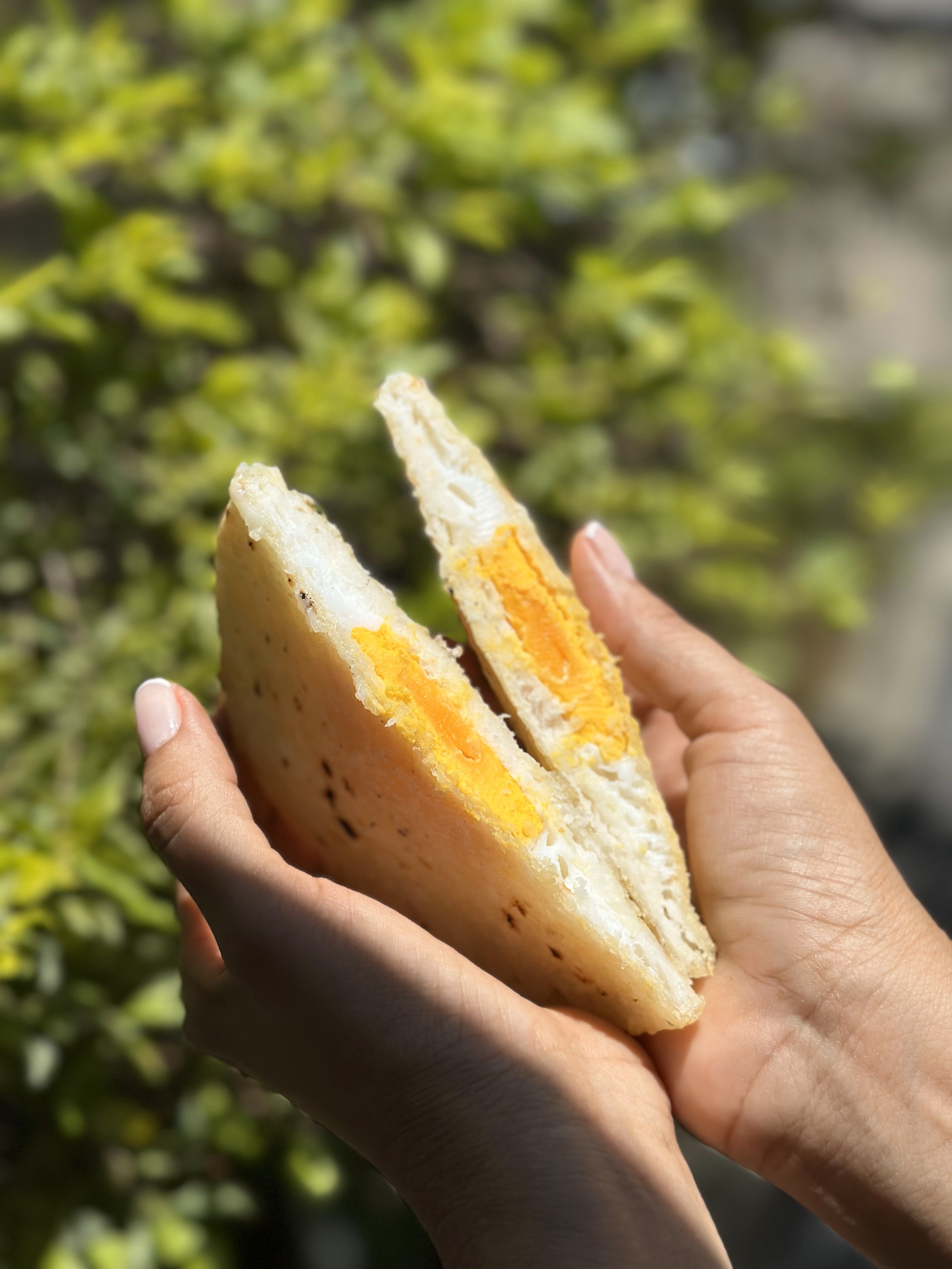 Arepa con huevo revuelto, queso cuajada y queso mozzarella.