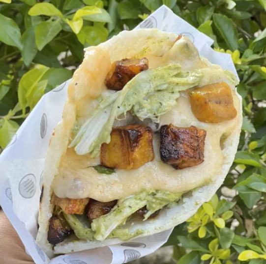 Arepa con pollo desmechado en salsa casera de cilantro, maduritos asados y queso fundido con albahaca .