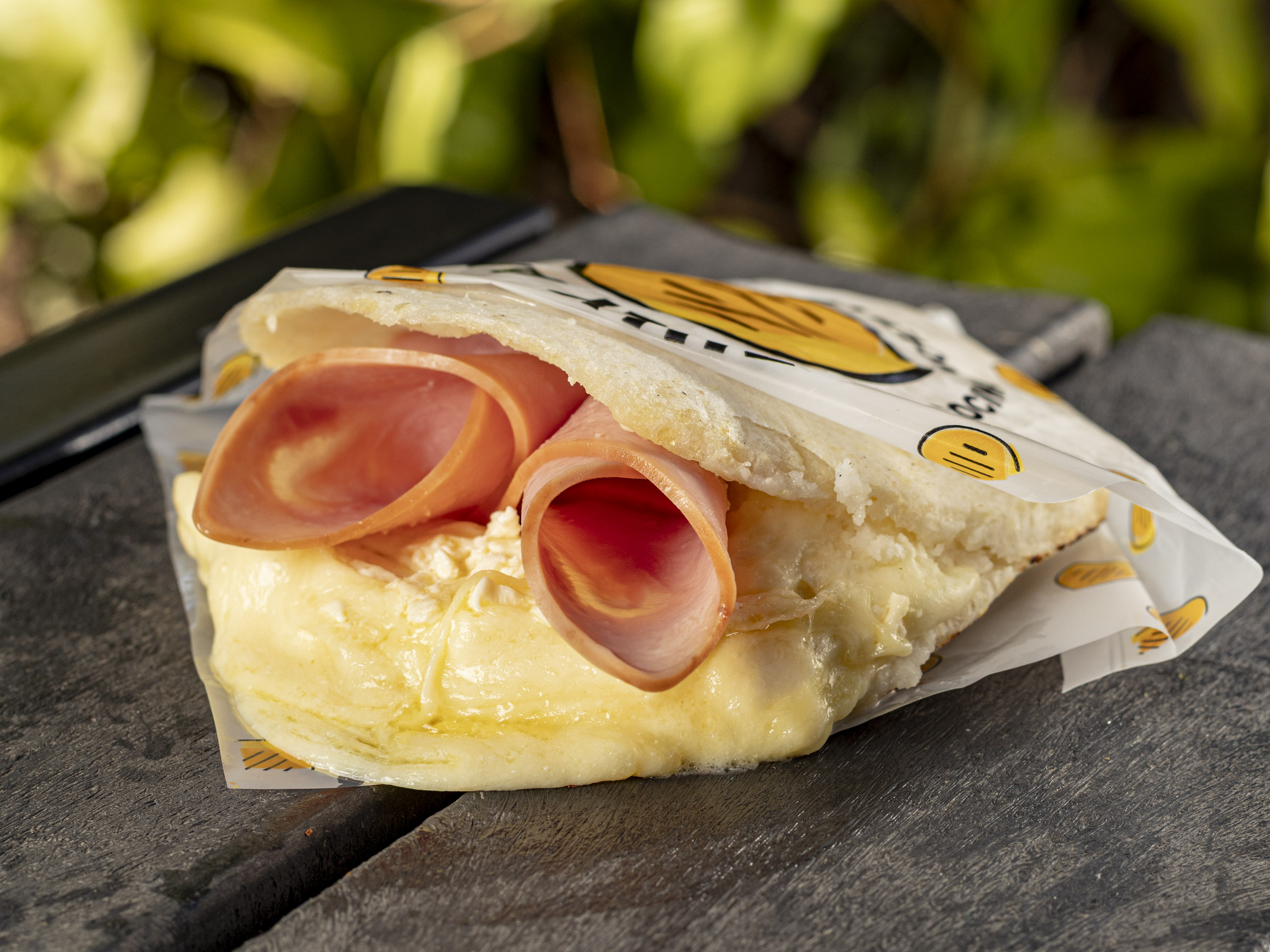 Arepa con jamón artesanal y queso fundido con salsa ancestral.