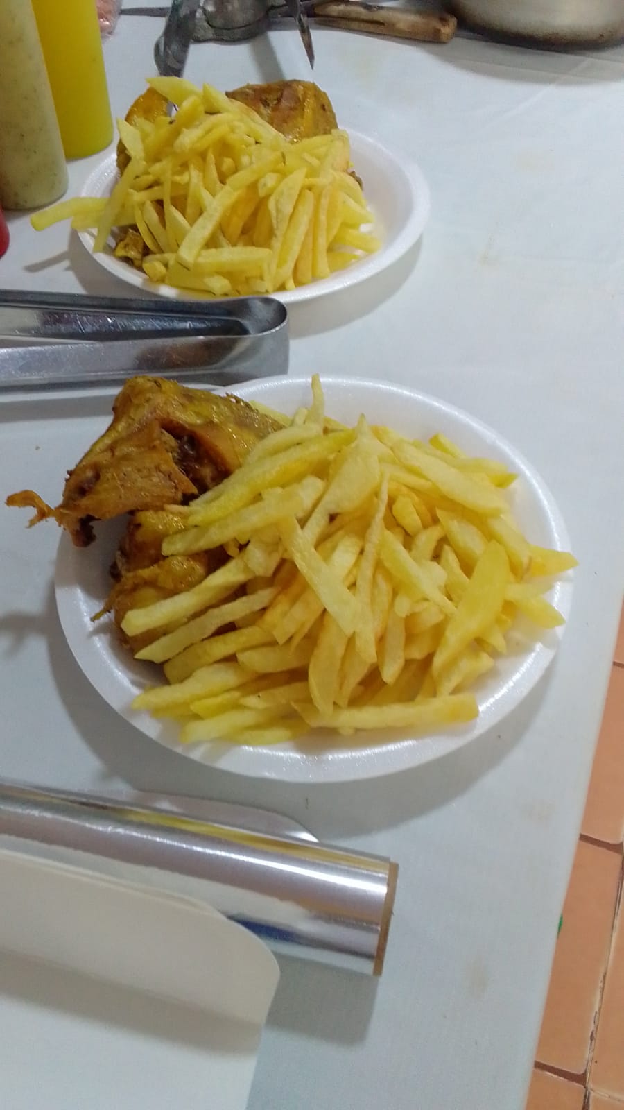 Muslo o contra muslo de pollo, papas francesas y ensalada de la casa.
