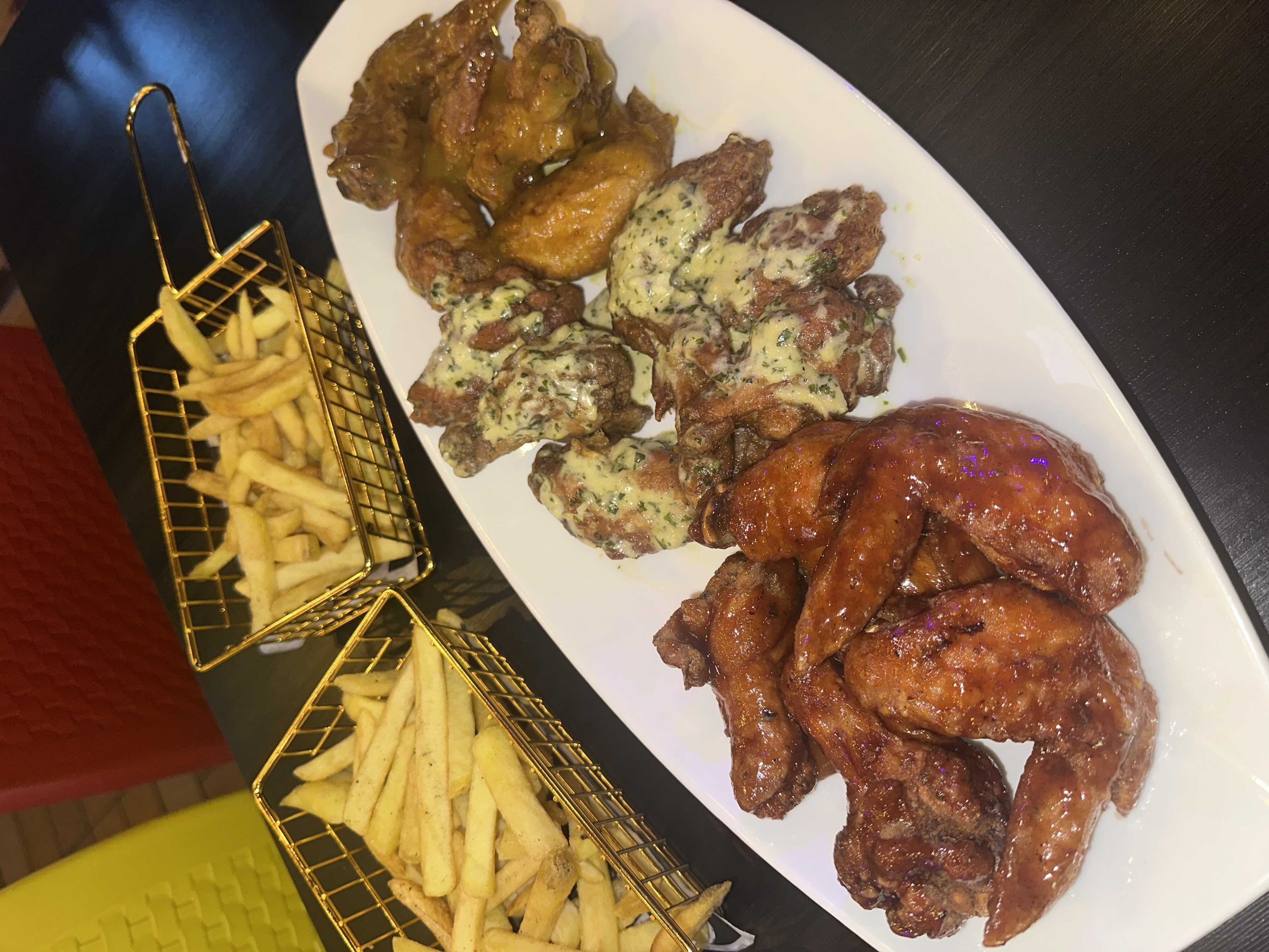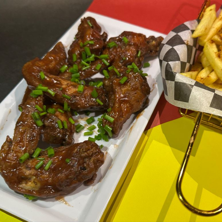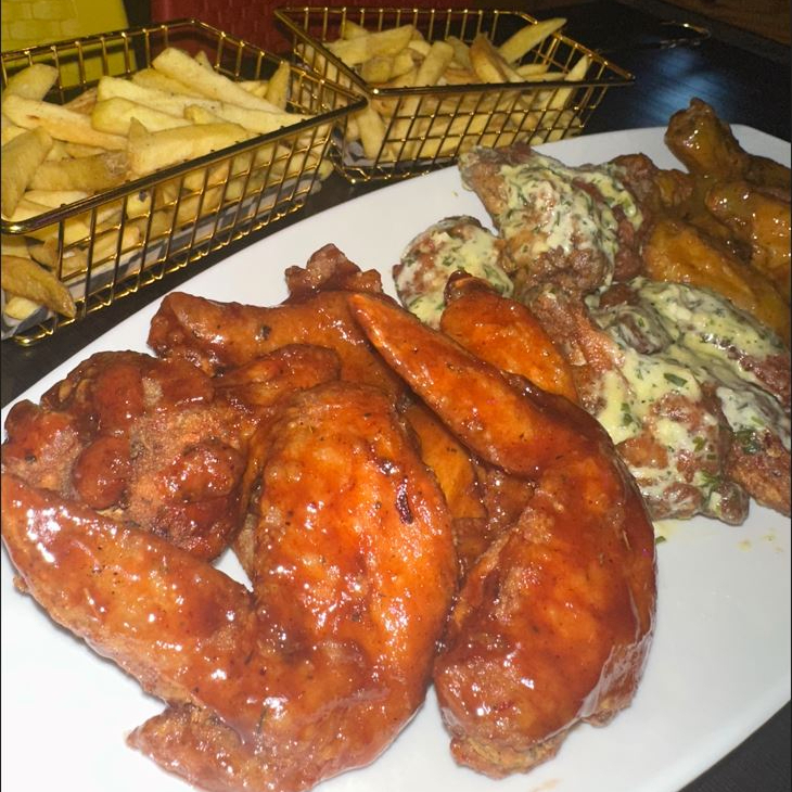 Bañadas en salsa de tu preferencia (ajo parmesano, BBQ normal, BBQ tropical, BBQ ranch, picantes búfalo, miel mostaza, salsa de tocineta), acompañadas con papa a la francesa.