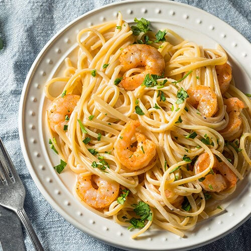Tiernos camarones bañados en una suave salsa de la casa y cubiertos con una capa de queso fundido perfectamente gratinado.