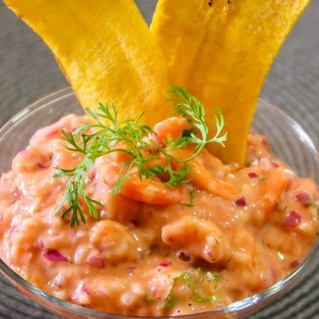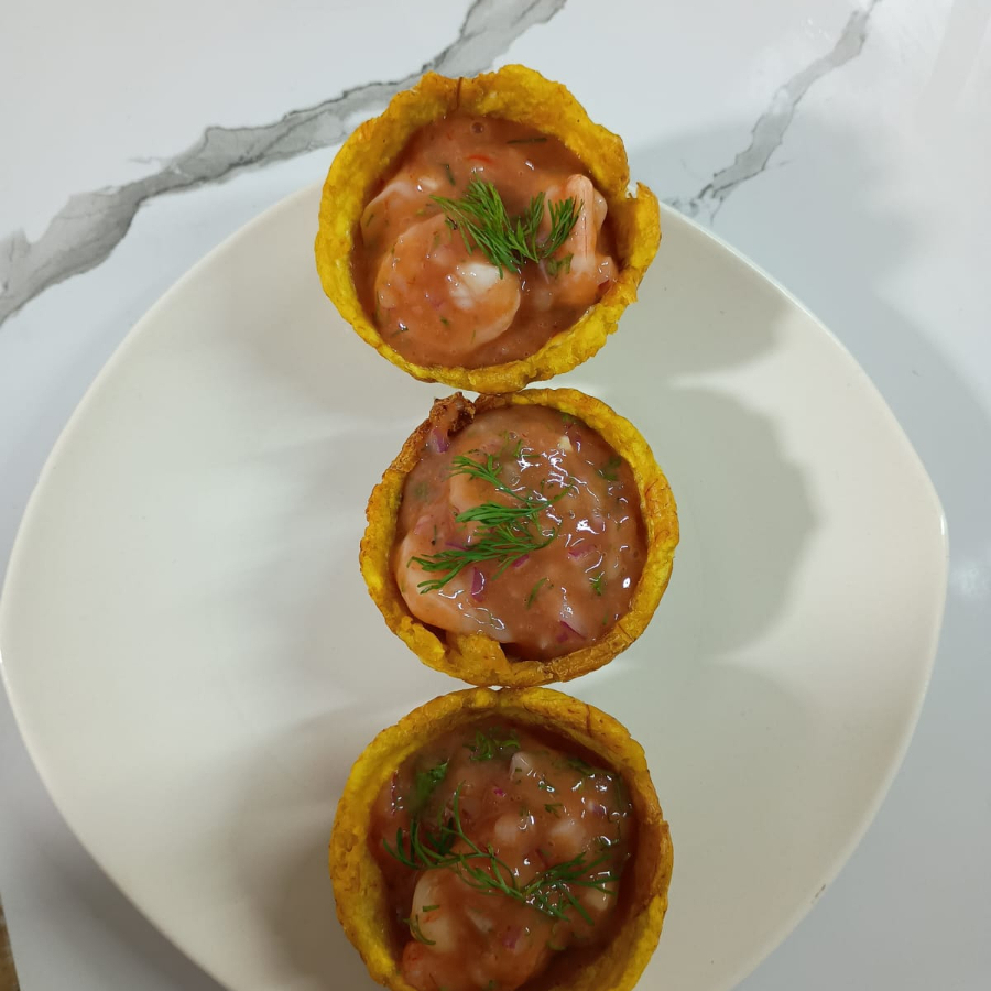 Crujientes canastas de plátano verde rellenas de camarones salteados con vegetales y un toque de nuestra sazón especial.