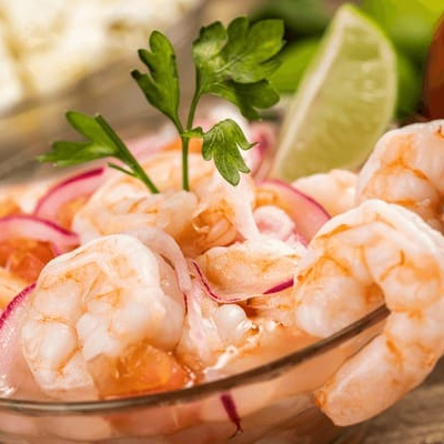 Camarones marinados en zumo de limón fresco, cebolla morada y especias, logrando el equilibrio perfecto de acidez.