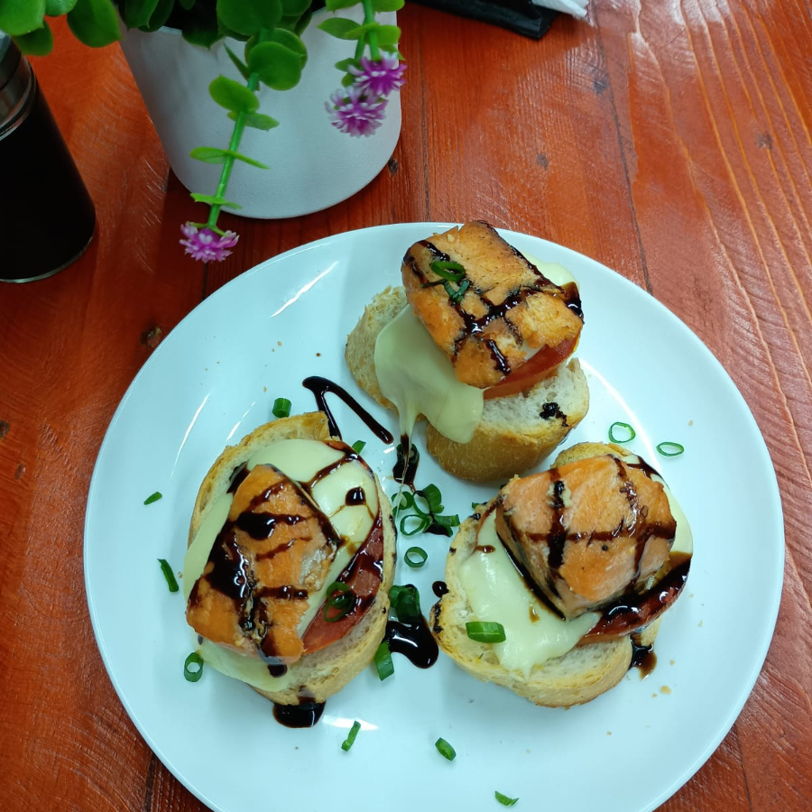 Finas láminas de salmón fresco sobre pan artesanal tostado, realzadas con ingredientes gourmet para un sabor sofisticado.