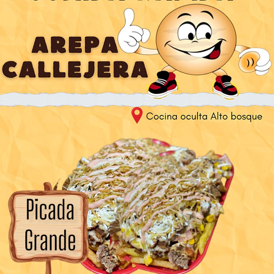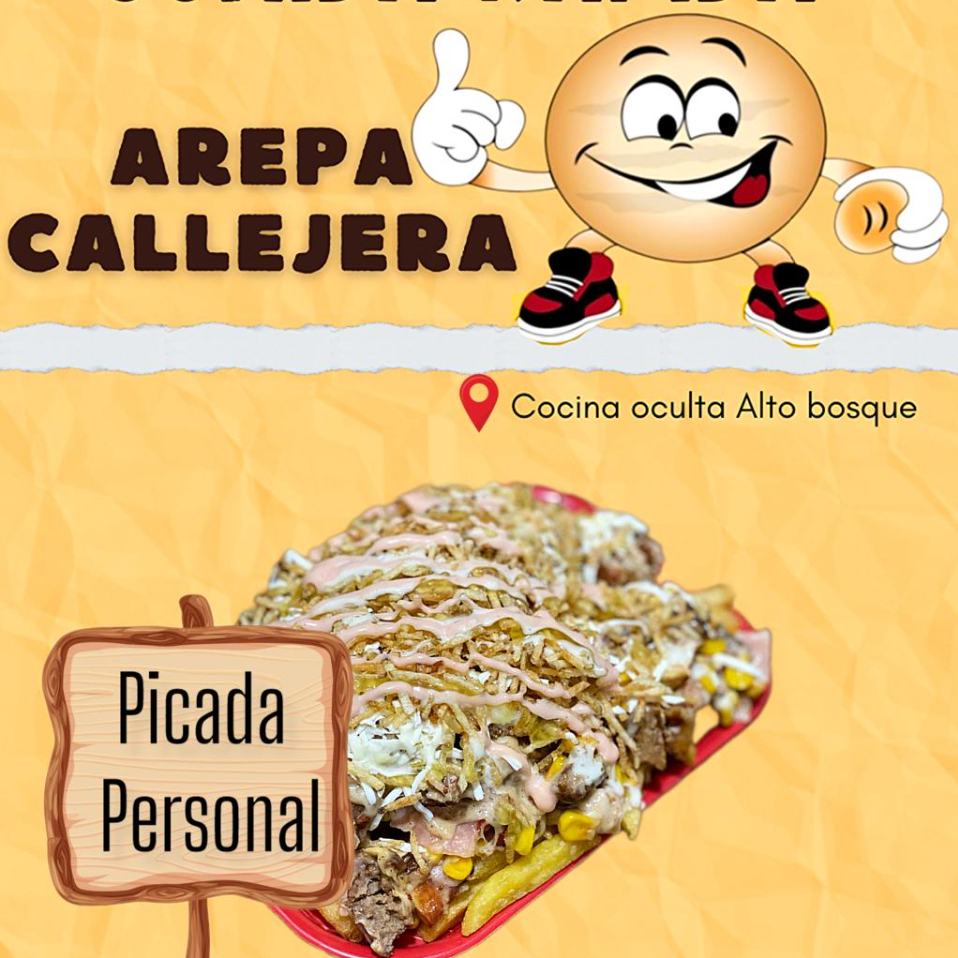 Arepa de maíz 100 natural, queso costeño, papas ripio y salsas a elección, carne, pollo, chorizo, chicharrón, jamón, madurito y maíz.