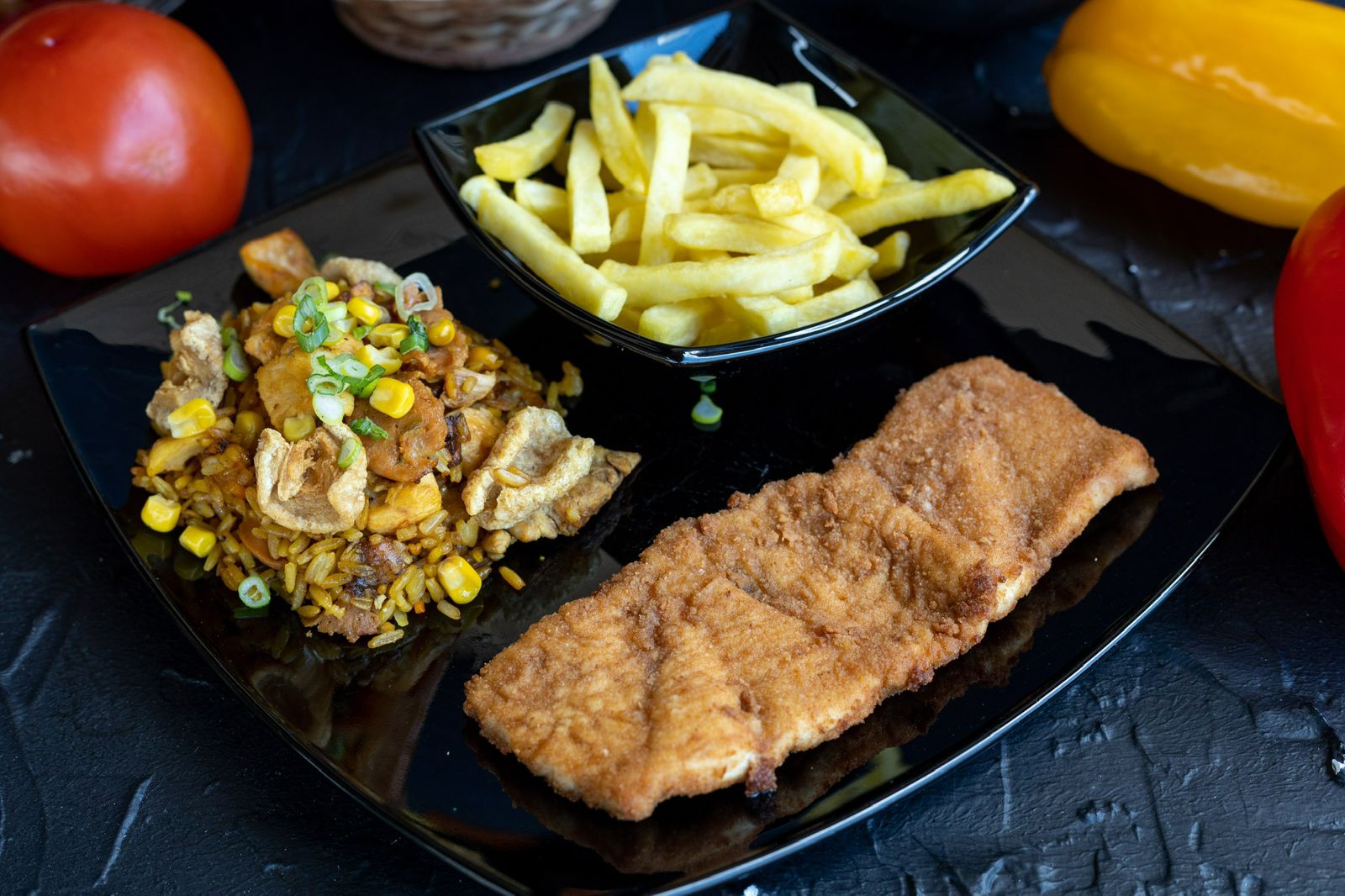 Trozos de pollo apanado o a la plancha en salsa de naranja de la casa, acompañados de arroz paisa o ranchero, papas a la francesa o chop suey.