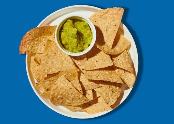 Nachos con totopos de maíz, proteína a elección, frijoles negros, queso, guacamole y pico de gallo.