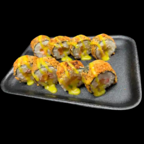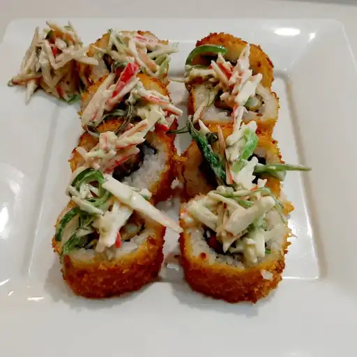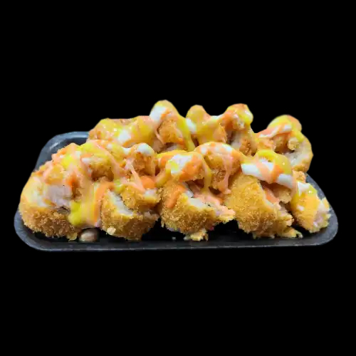 Roll de salmón, palmito de cangrejo y aguacate con topping de camarones apanados en salsa dynamite.