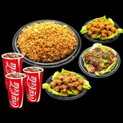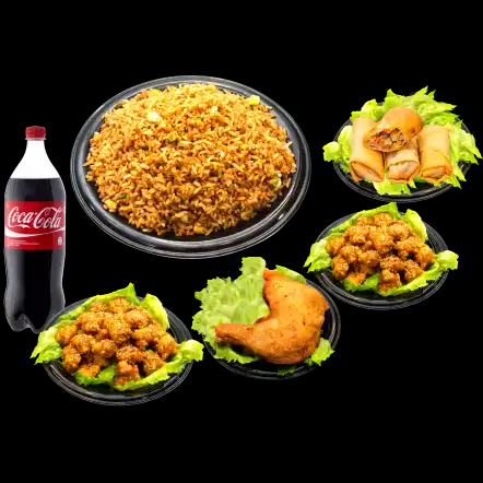 Arroz con vegetales, 4 lumpias, 3 proteínas y 1 gaseosa de 1.5 L a elección, para 4 personas.