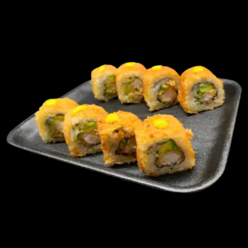 Sushi con pollo teriyaki, aguacate, cebollín y queso crema envuelto en panko.
