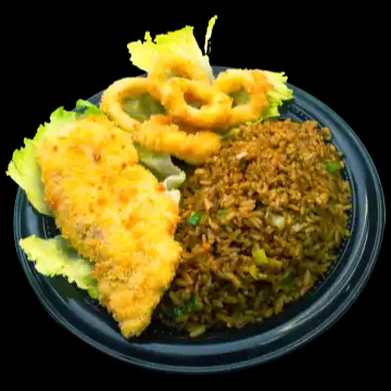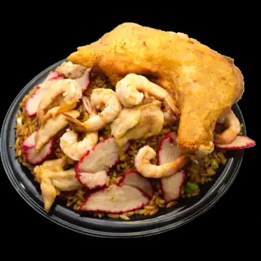 Arroz de pollo, camarones y presa de pollo frito.