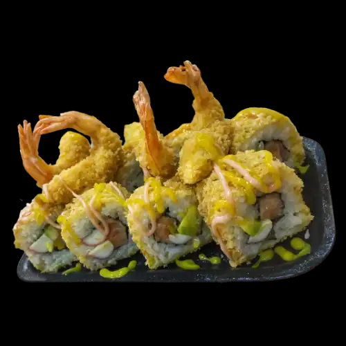 Sushi con camarón tempura, palmitos y aguacate envuelto en panko.