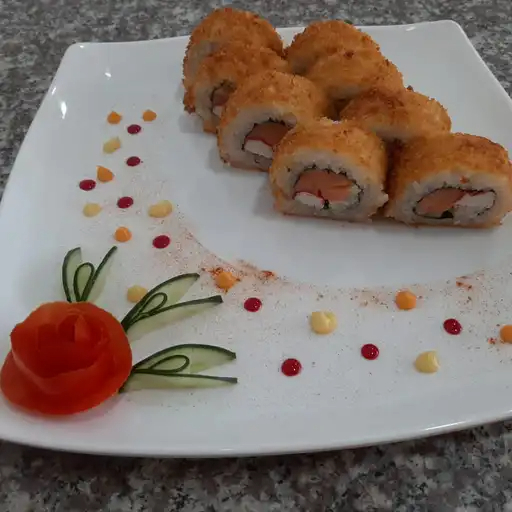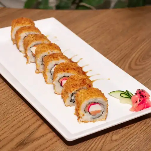 Sushi con salmón, queso crema y aguacate envuelto en panko.