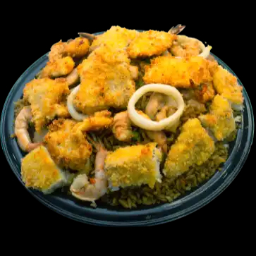 Arroz con camarones, pollo y 2 acompañantes a elección.