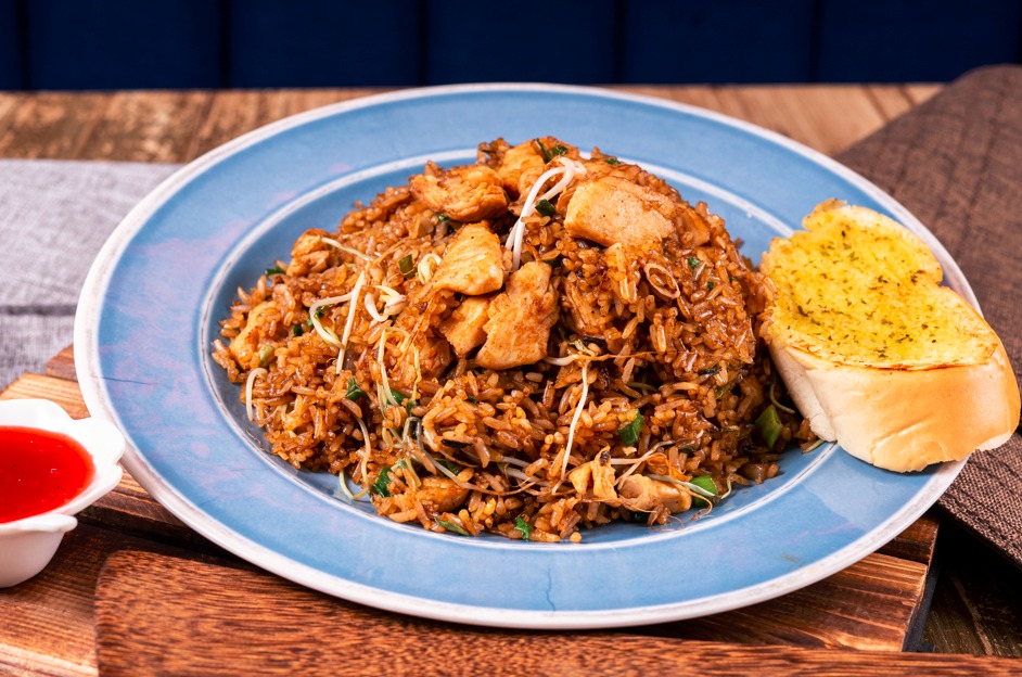 Arroz frito, pollo, cerdo, raíces chinas, cebollín.