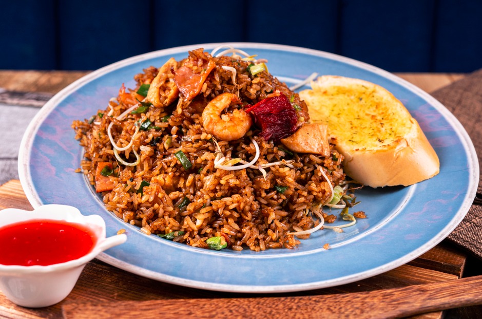 Arroz frito, pollo, cerdo, camarón y jamón, raíces chinas y cebollín.